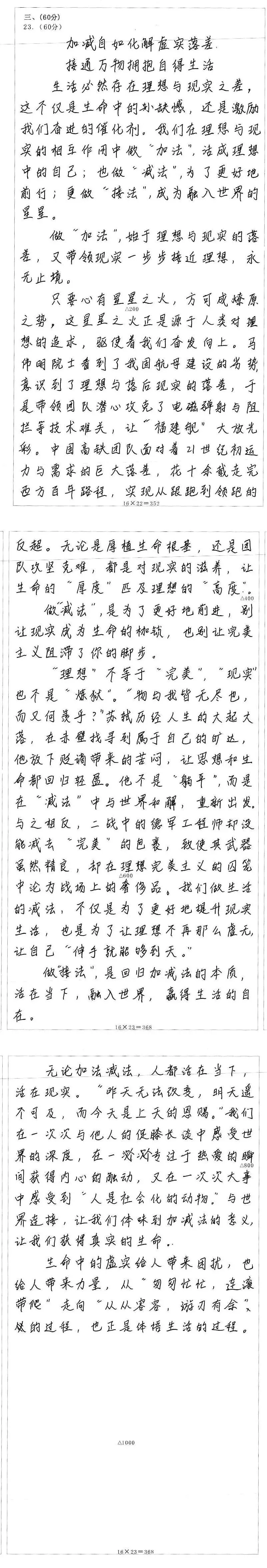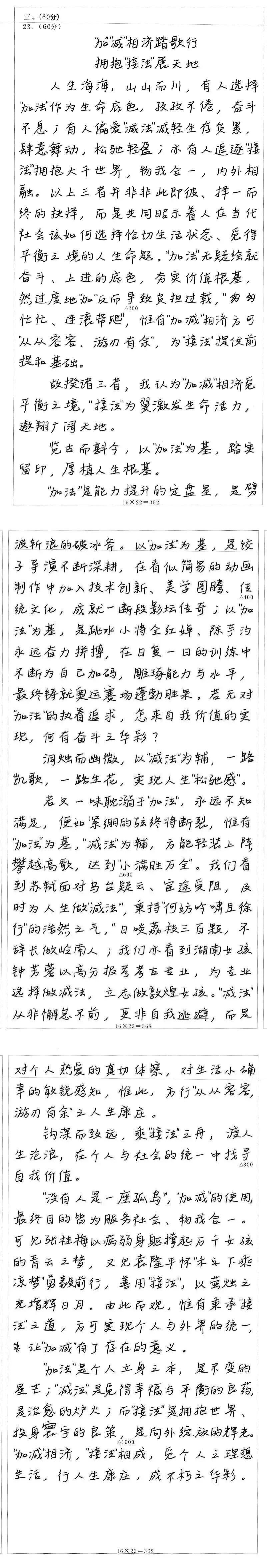 本题直指青少年成长中的真实困惑,要求考生结合自身体验来写,这意味着考生需将上述思考,落到自己真实的学习生活和成长感悟上来。下笔时,考生不妨自问:我的“加法”在何处?何种“减法”令我轻盈?又与何人何物“相接”而感受到圆融?在对“忙与闲”“个体与社会”“传统与当代”的思辨中,展现新一代青年的独立思考与精神自觉。