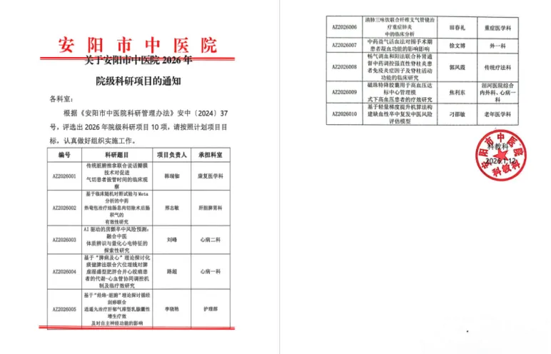 为深入贯彻落实医院科研发展规划,激发临床科研创新活力,根据《安阳市中医院科研学术成就奖励与管理办法》(安中〔2024〕38号)与《安阳市中医院科研管理办法》(安中〔2024〕37号)文件精神,我院于2026年1月10日成功举行了2026年度院级科研项目评审会,计划设立10项课题并给予专项经费支持。本次项目申报自2025年12月启动以来,得到了全院各科室的积极响应,共收到申报课题26项。经科教科初步形式审查,其中21项符合要求的课题进入专家评审环节。