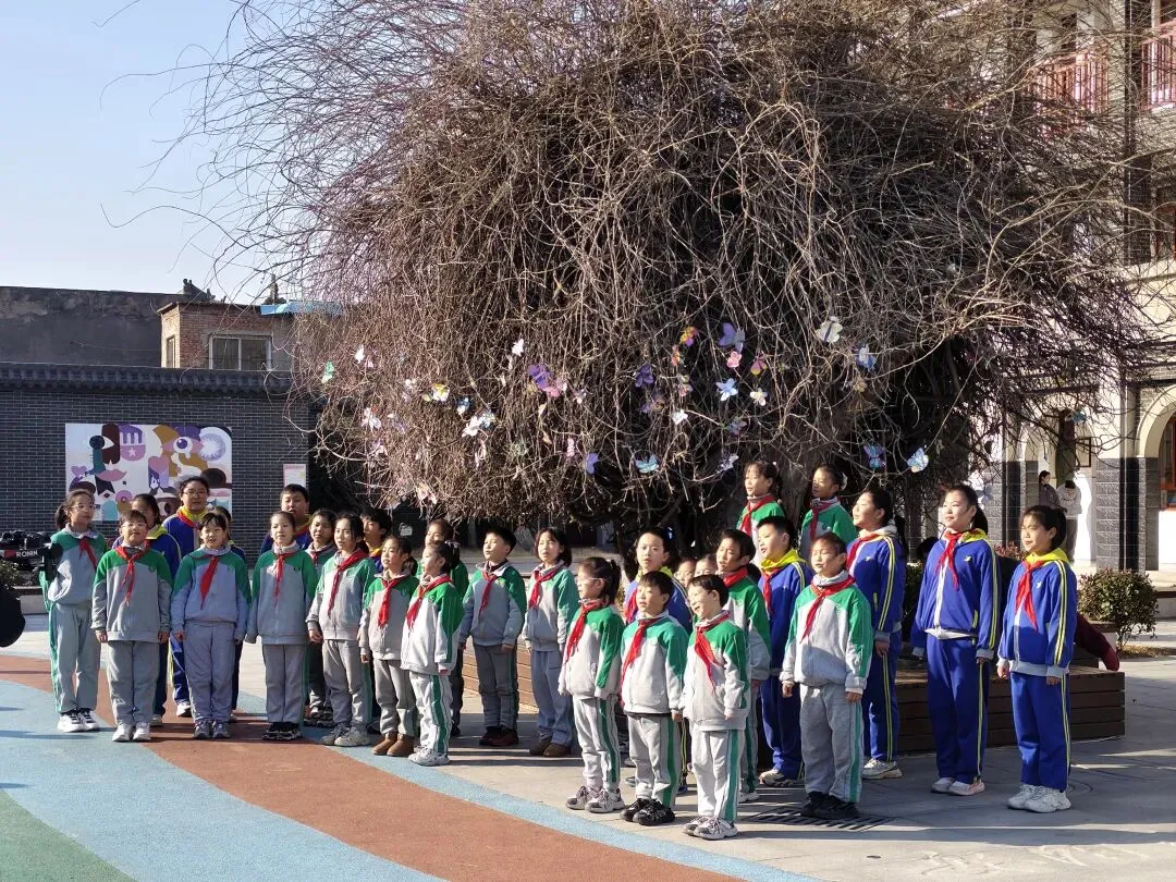 整齐列队的学生们唱响经典曲目,清亮的童声在校园中回荡。领导专家们认真聆听,称赞这是我校将校园环境与美育教学有机结合的生动体现。