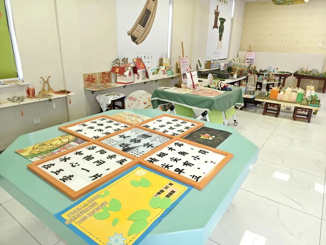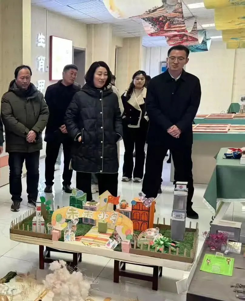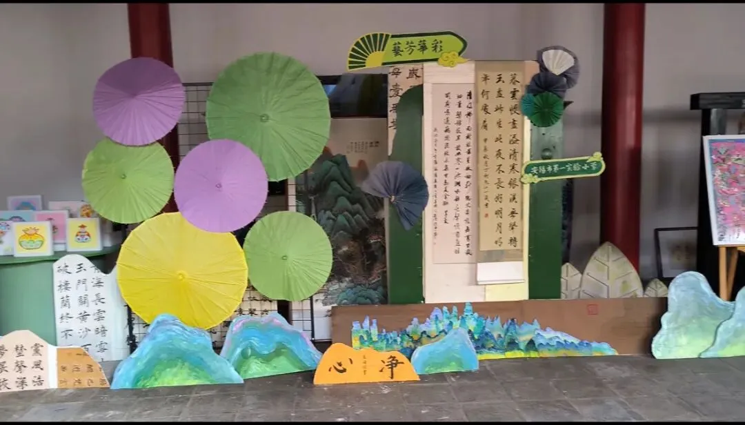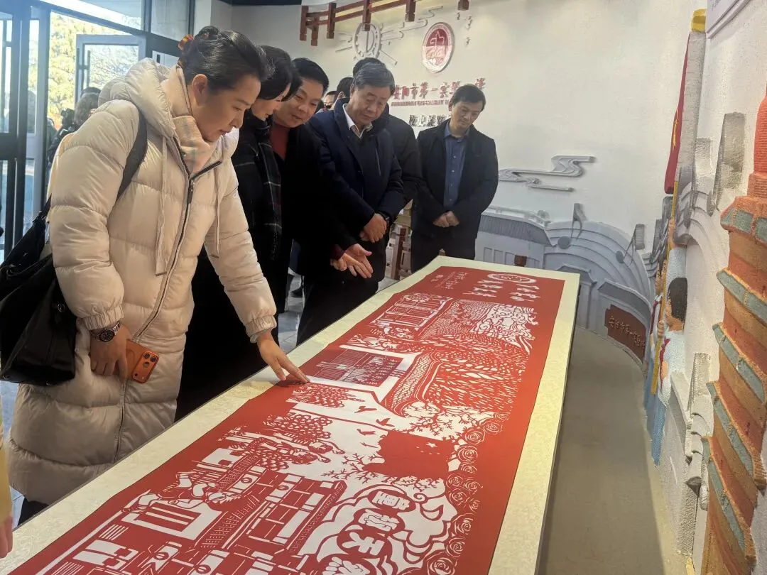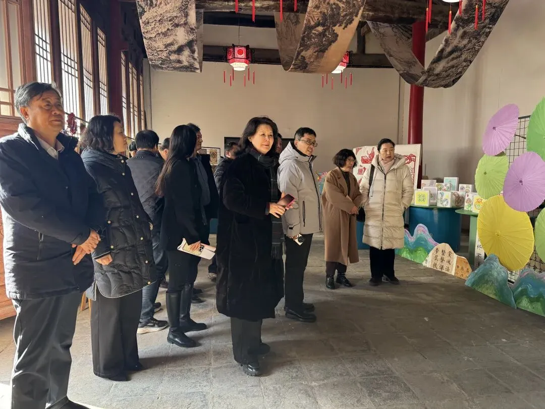 古建风韵中,古琴雅韵缓缓流淌,千里江山图背景下,学生创作的剪纸、拓片、团扇、脸谱等非遗融合作品静静陈列,传统美学的深厚底蕴在古韵与新声的碰撞中徐徐展开。领导们沉浸式体验我校的艺术教育成果,对文化传承与艺术教育实践相结合的模式给予认可,认为这是校园文化建设与美育发展的鲜活范例。
