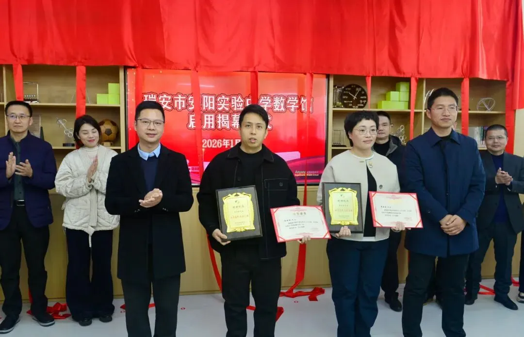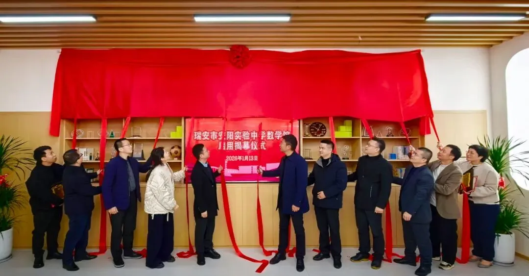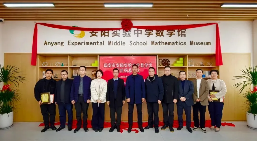 随后,温州市教研院领导、瑞安市教育局领导、专家学者、学校领导及捐赠家长共同为数学馆揭幕。红色幕布缓缓落下,一座集教学、实践、展示于一体的现代化数学馆正式亮相,现场嘉宾与师生代表共同合影留念,定格这一重要时刻。