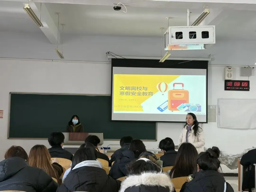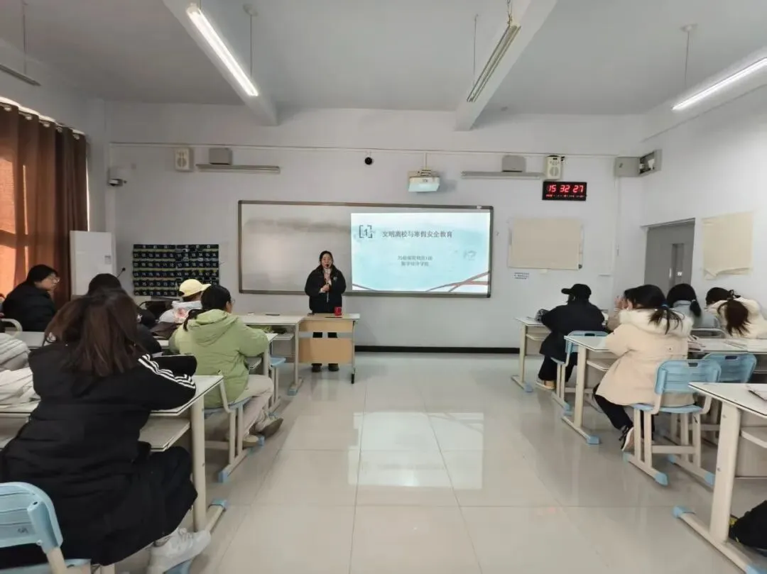在寒假安全教育环节,老师从网络安全、交通安全、人身安全、财物安全、饮食安全、兼职与社会实践等方面为学生敲响安全警钟。尤其是网络安全方面,老师们重点解读常见诈骗手段的危害与防范技巧,引导学生文明上网,远离网络不良信息。此外,老师要求学生离校后主动向家长和辅导员报备行程安排,抵达目的地后第一时间报平安,假期期间保持通讯设备畅通,遇突发情况及时与学校、家人沟通联系。