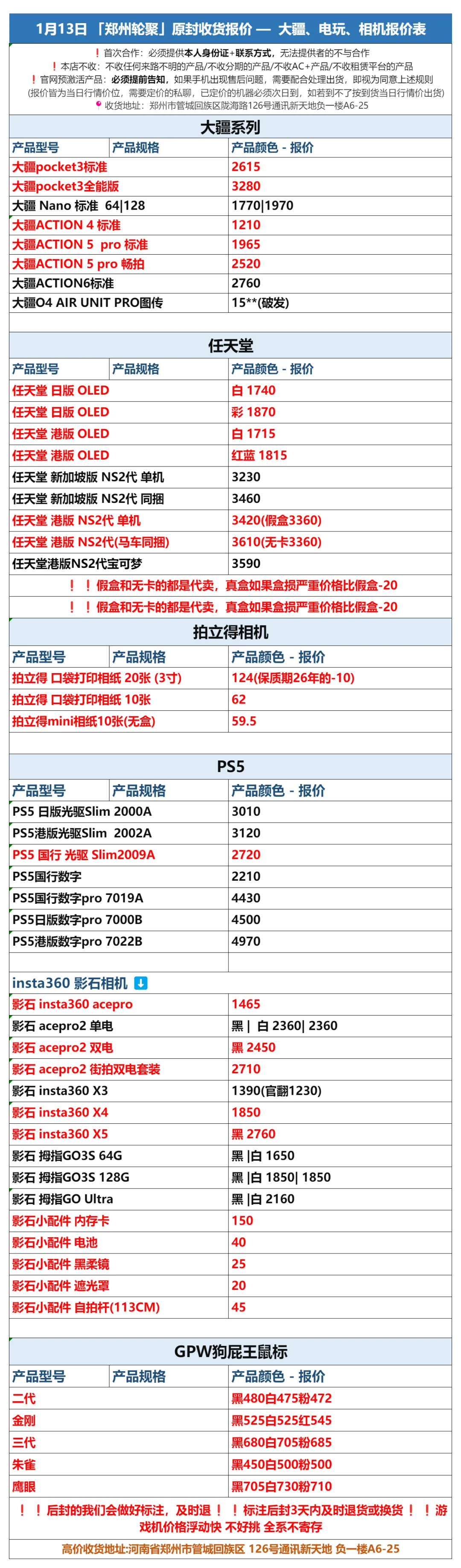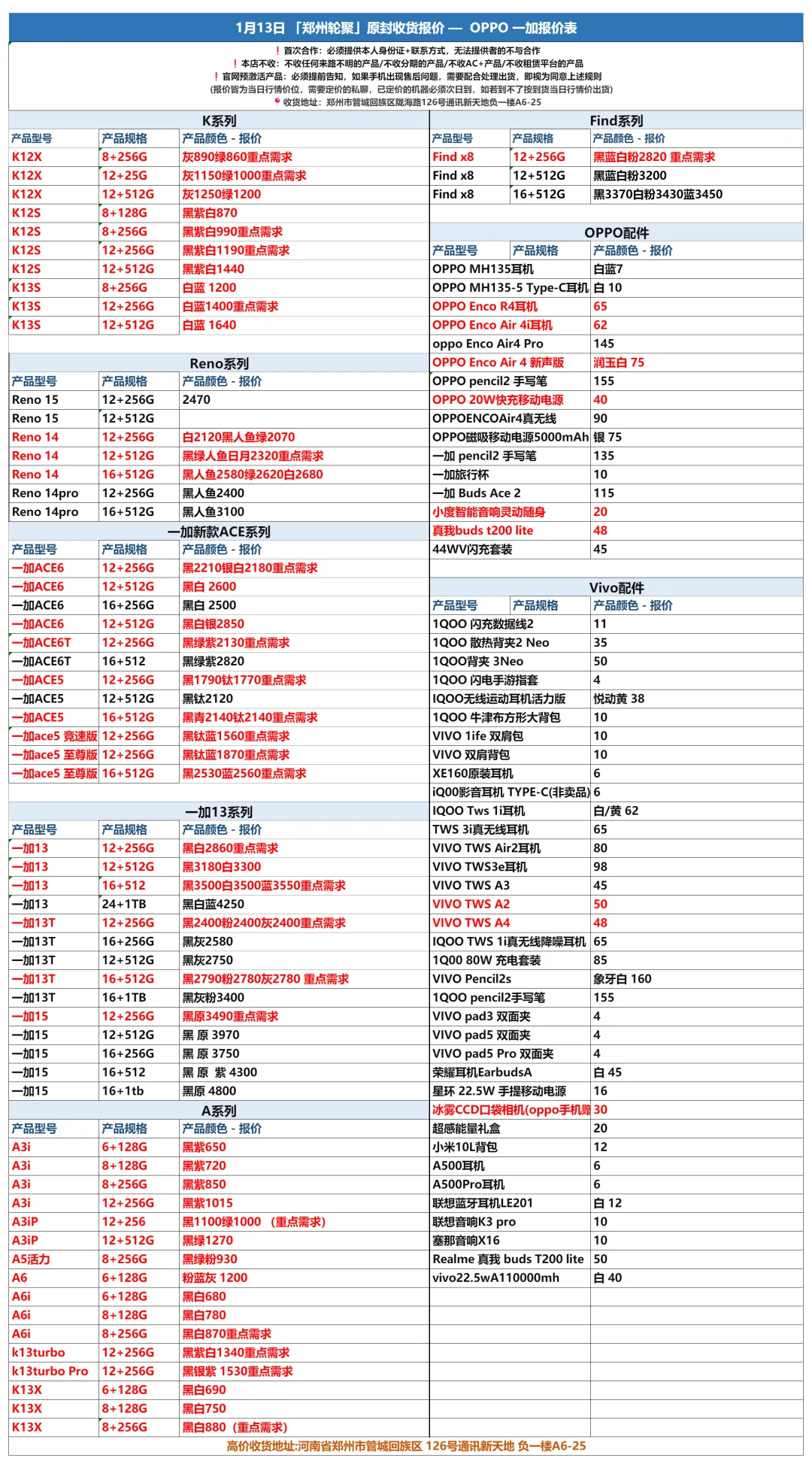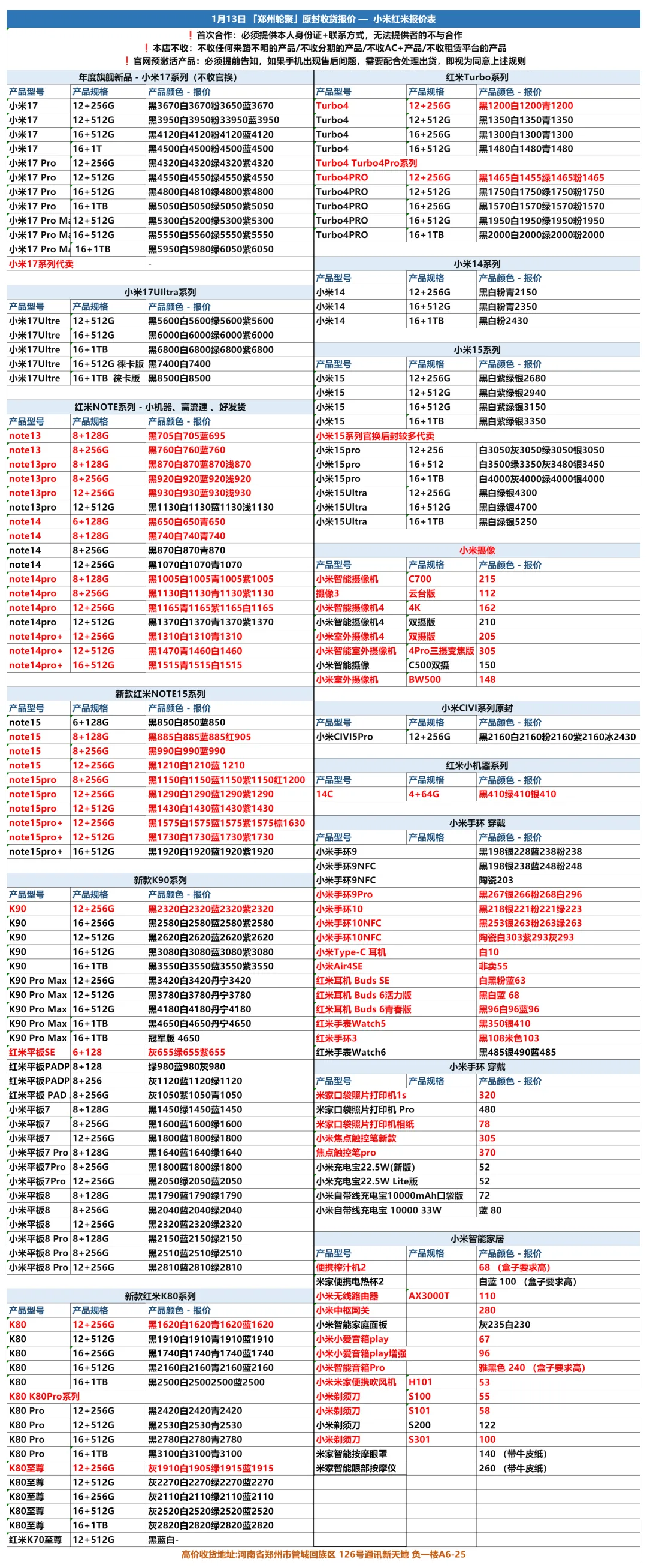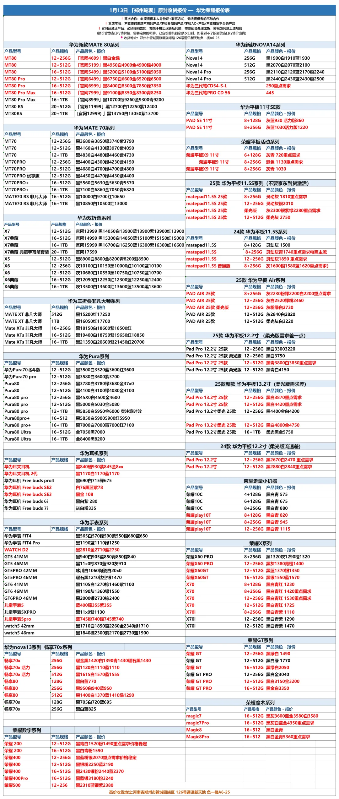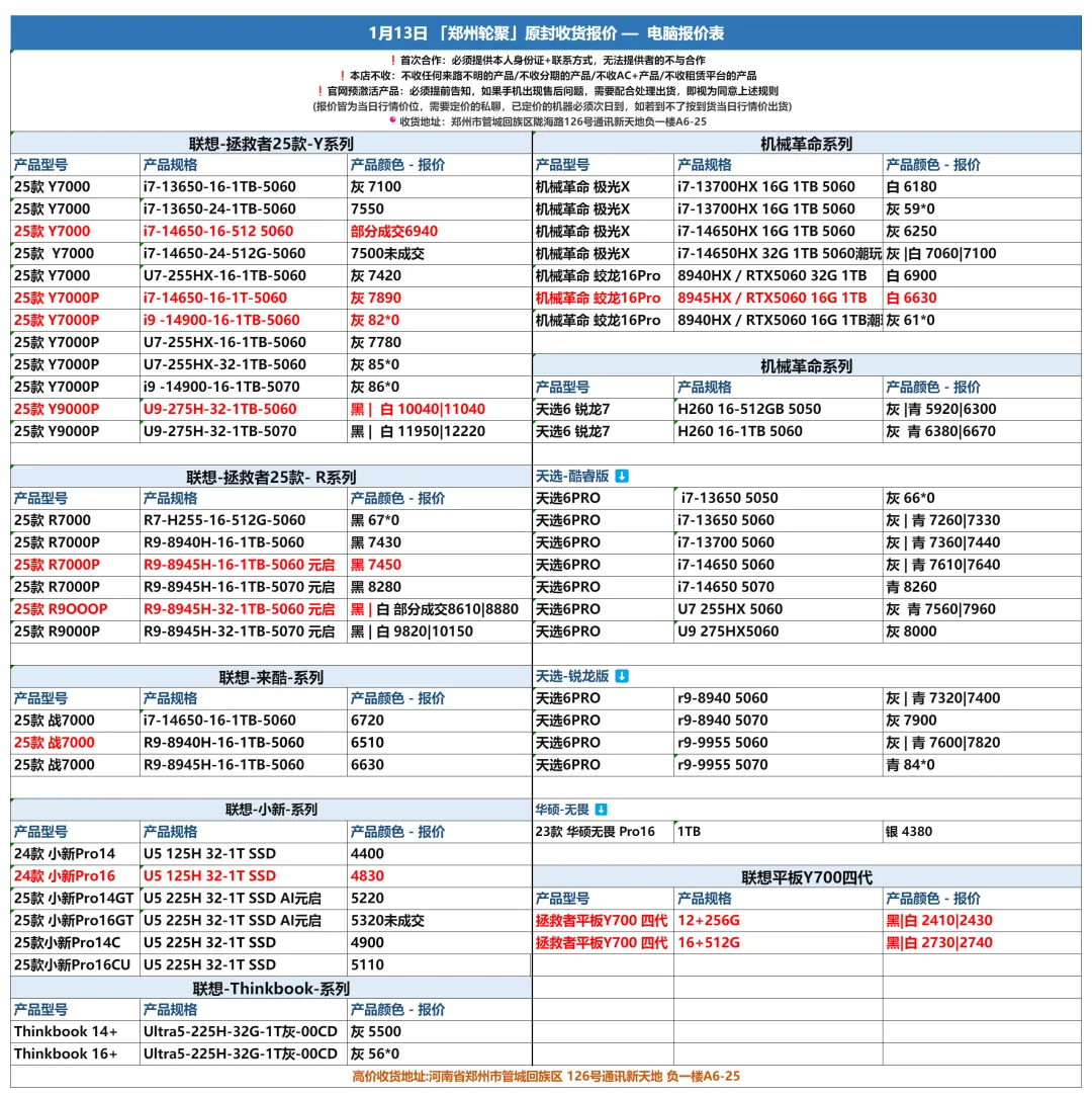 郑州轮聚通讯 2026年1.13日数码报价更新