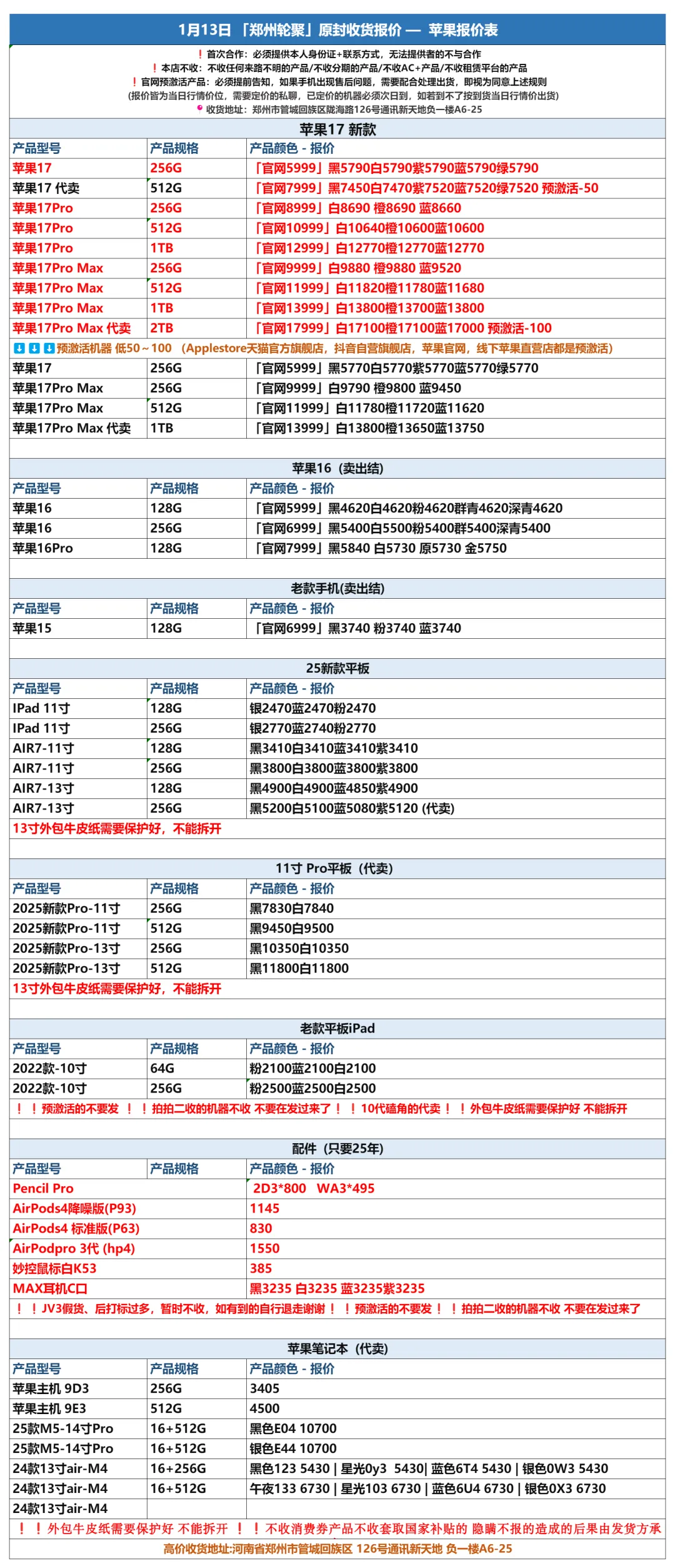 >郑州轮聚通讯 2026年1.13日数码报价更新