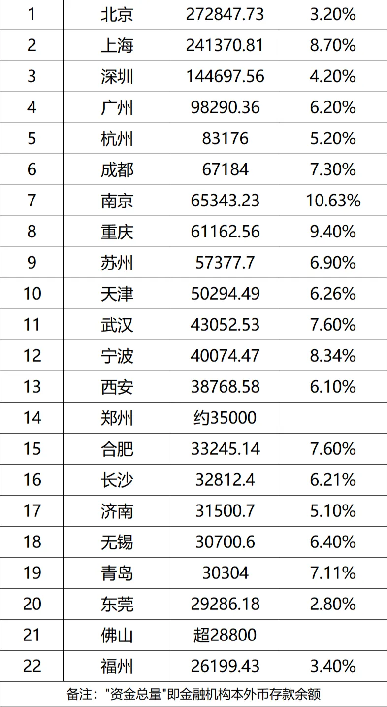 资金总量,这个城市“财富家底”的核心指标,从来都是观察城市竞争力的最佳窗口。2025年中国城市本外币存款余额榜单新鲜出炉,北京、上海以27万亿、24万亿量级稳居第一梯队,深圳14.47万亿独占第三。