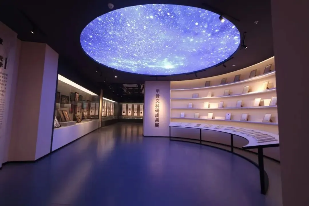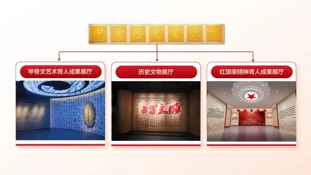 安阳学院中原历史文化馆坐落于校内图书馆东主楼二层,总面积近2000平方米,设甲骨文艺术育人成果展厅、历史文物展厅与红旗渠精神育人成果展厅三大主题展区。本馆秉承“尊重历史、再现历史、传扬历史”的理念,深入挖掘中原地区丰厚的历史文化资源,将其系统融入教学科研、文化普及与成果展示之中。通过实物、图文、雕塑、光影、场景复原及声像等多种展陈方式,融合艺术手法与科技手段,打造沉浸式、互动式的观展体验,实现历史知识的场景化传播与人文精神的情感化浸润。
