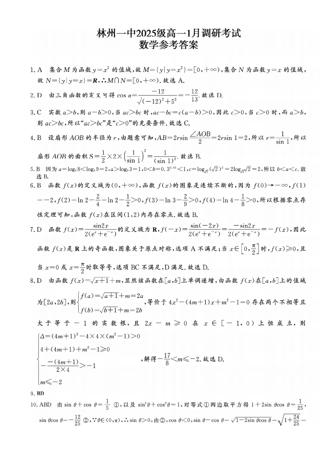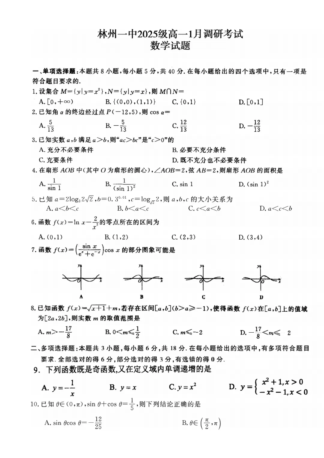 >【高一上1月考试】河南省安阳市林州市第一中学2025-2026学年高一上学期1月调研考试数学试题及答案(文末下载)
