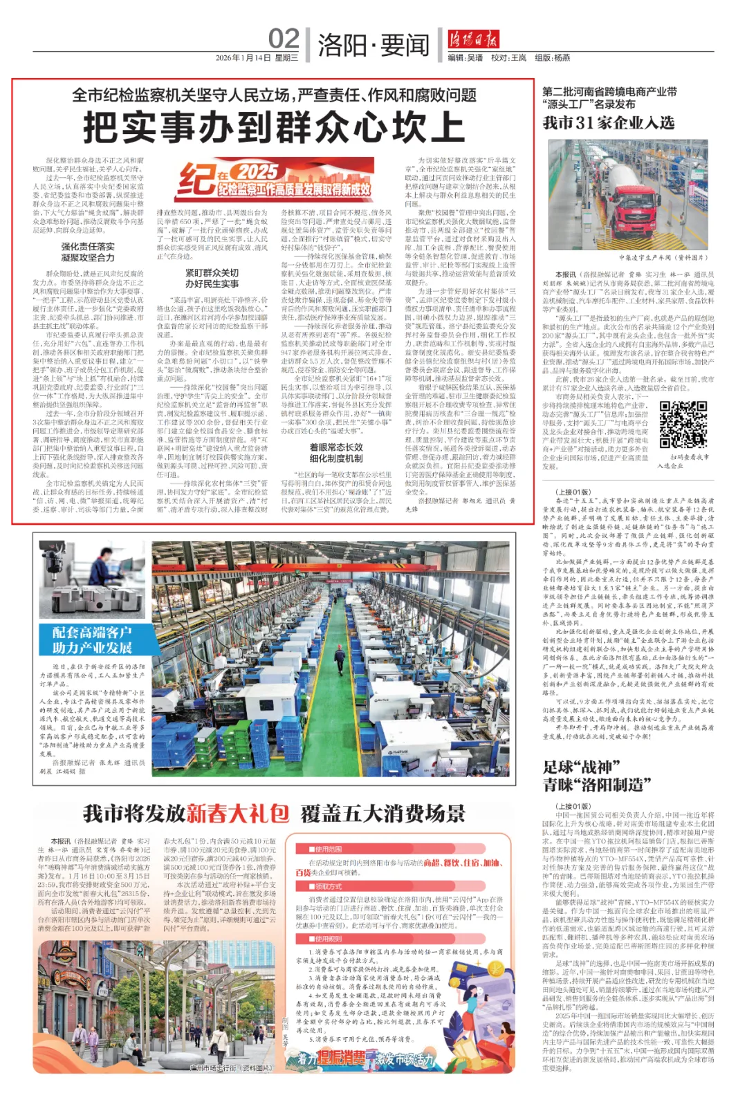 回眸奋进路,聚力谱新篇。2025年,全市纪检监察机关深入学习贯彻习近平新时代中国特色社会主义思想特别是习近平总书记关于党的自我革命的重要思想,全面落实中央纪委、省纪委和市纪委全会精神,紧扣市委决策部署,持续强化政治监督,纵深推进正风肃纪反腐,各项工作取得新进展新成效。《洛阳日报》、“清风洛阳”微信公众号自即日起开设《“纪”在2025 纪检监察工作高质量发展取得新成效》栏目,全面展现全市纪检监察机关以高质量监督护航现代化洛阳建设的生动实践,敬请关注。全市纪检监察机关坚守人民立场,严查责任、作风和腐败问题把实事办到群众心坎上