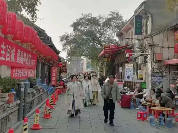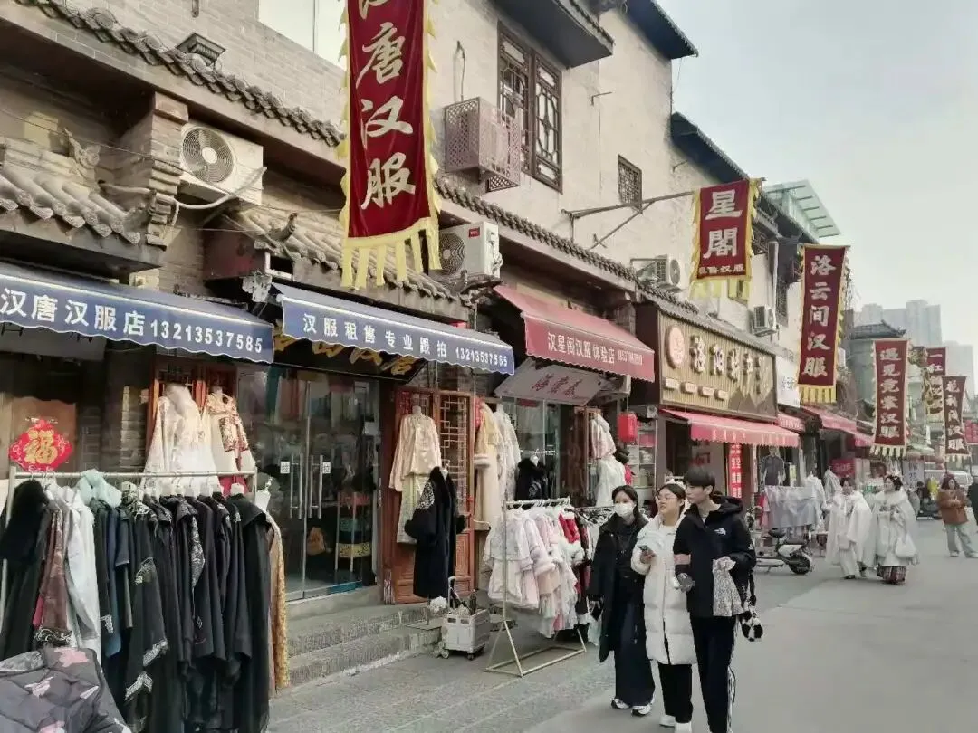 洛阳最让我觉得有趣的是穿汉服的年轻人非常多,而且男性也有很多穿汉服的,这让我很是惊讶。街头巷尾遍布着汉服租赁店,我想起之前访问菏泽市曹县时,听说当地以汉服制造闻名,据说全国租赁用的汉服大多产自那里。偶尔还能看见女生穿着汉服,骑着迷你电动车呼啸而过,可惜没能抓拍下来,但那种时空倒错的穿越感成了此行印象最深刻的画面。