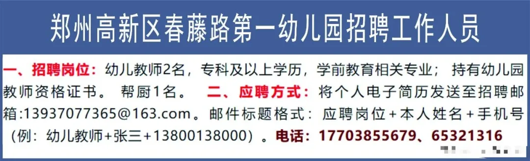 >郑州高新区春藤路第一幼儿园招聘工作人员