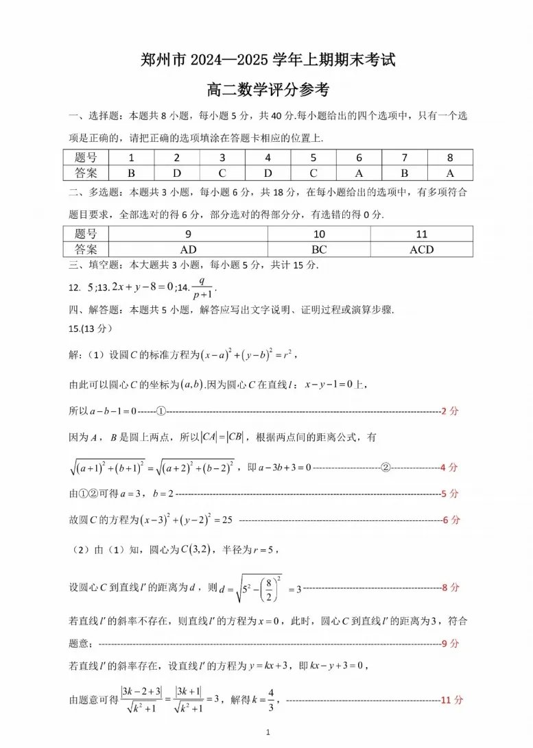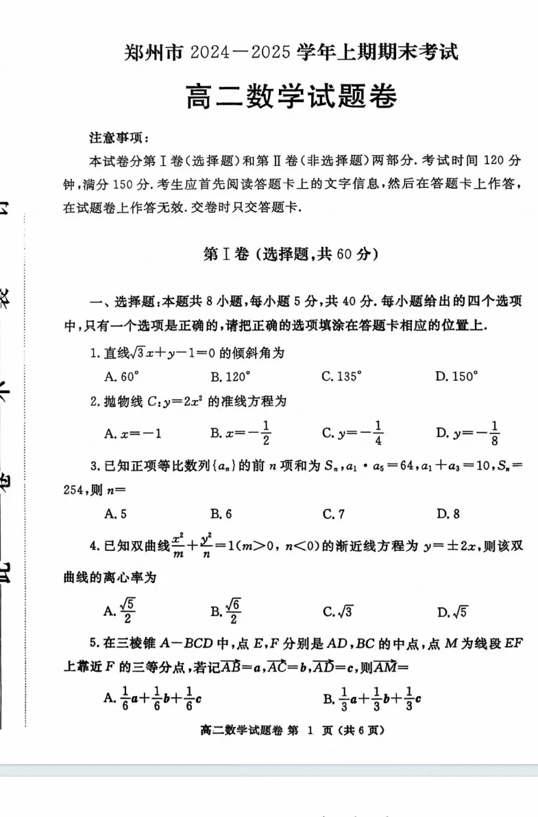 高二上:河南省郑州市2024-2025学年高二上学期期末卷及答案解析