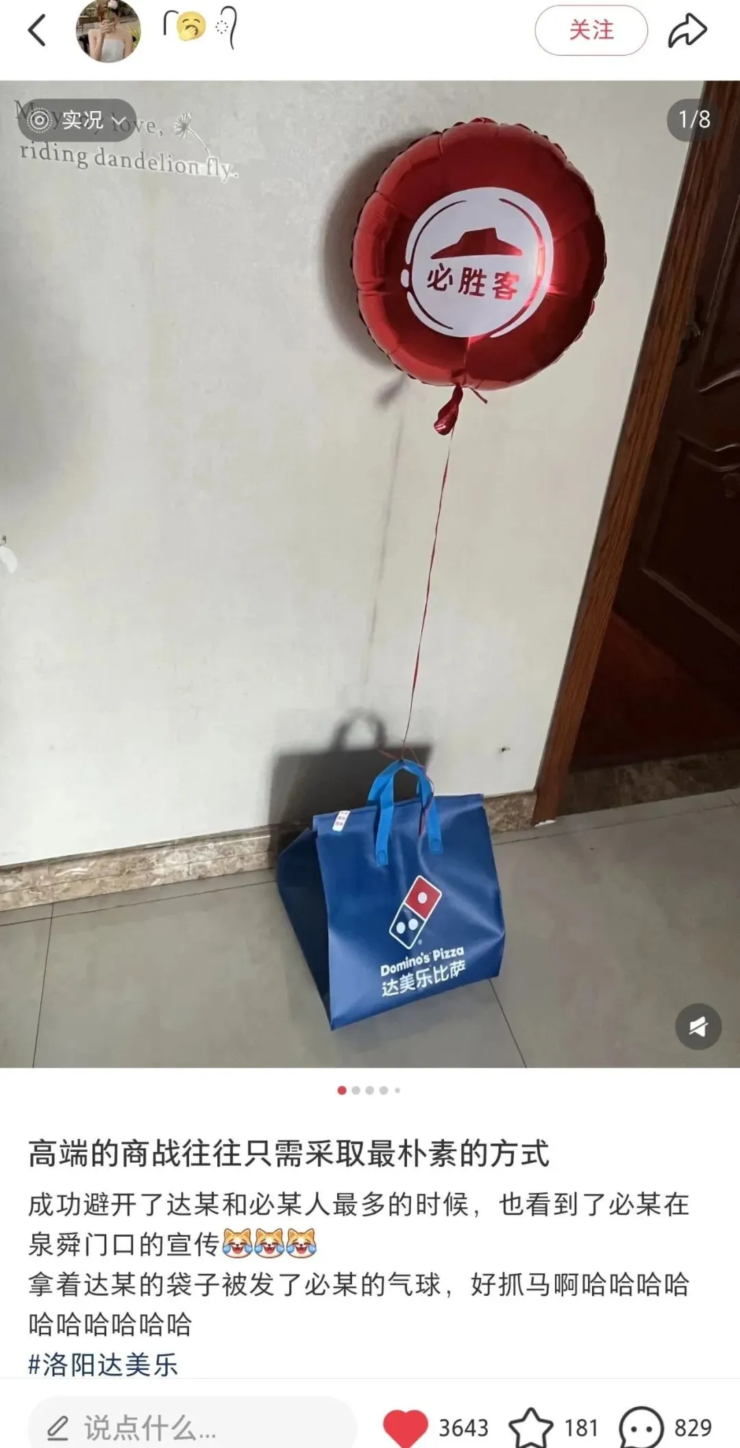 有趣的是,但凡达美乐在哪个城市首店开业之际,必胜客就会贴脸开大,在附近打出“吃披萨还得必胜客”宣传,精准拦截达美乐开业酬宾的消费者。有网友在社交媒体发帖说,高端的商战往往只需采取最朴素的方式,看到了必某在泉舜门口的宣传。必胜客的小哥拿着旗子和气球在美乐达门口喊着必胜客今日九块九。配图是地下放着达美乐的手提袋,上面系着必胜客的气球。真是笑不活了!商业的活力,正是在于这种短兵相接的竞争。