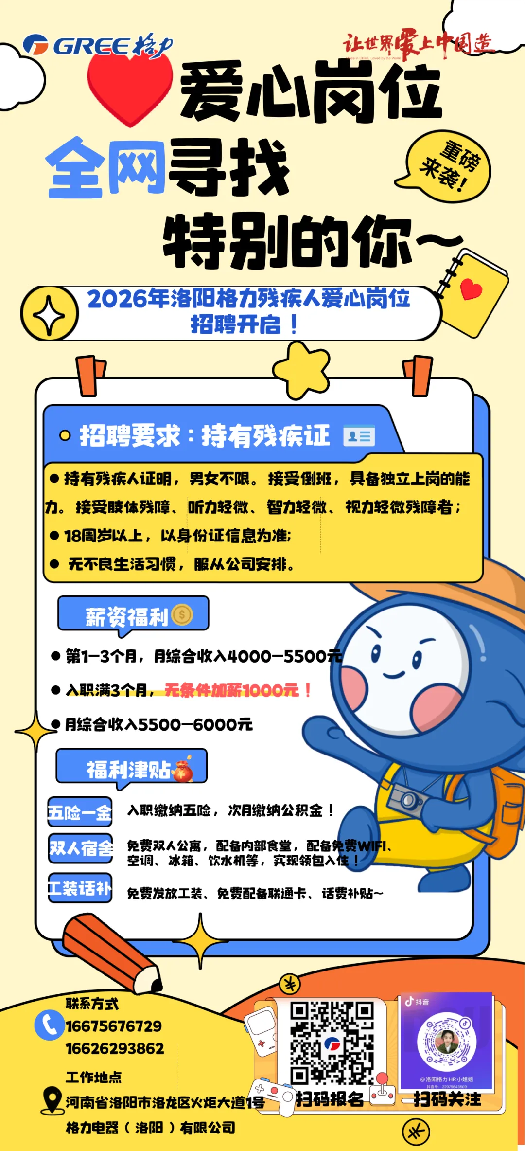 【洛阳格力】爱心岗位|残疾人专属 洛阳格力2026年残疾人招聘线下面试开启!名额有限,机不可失!