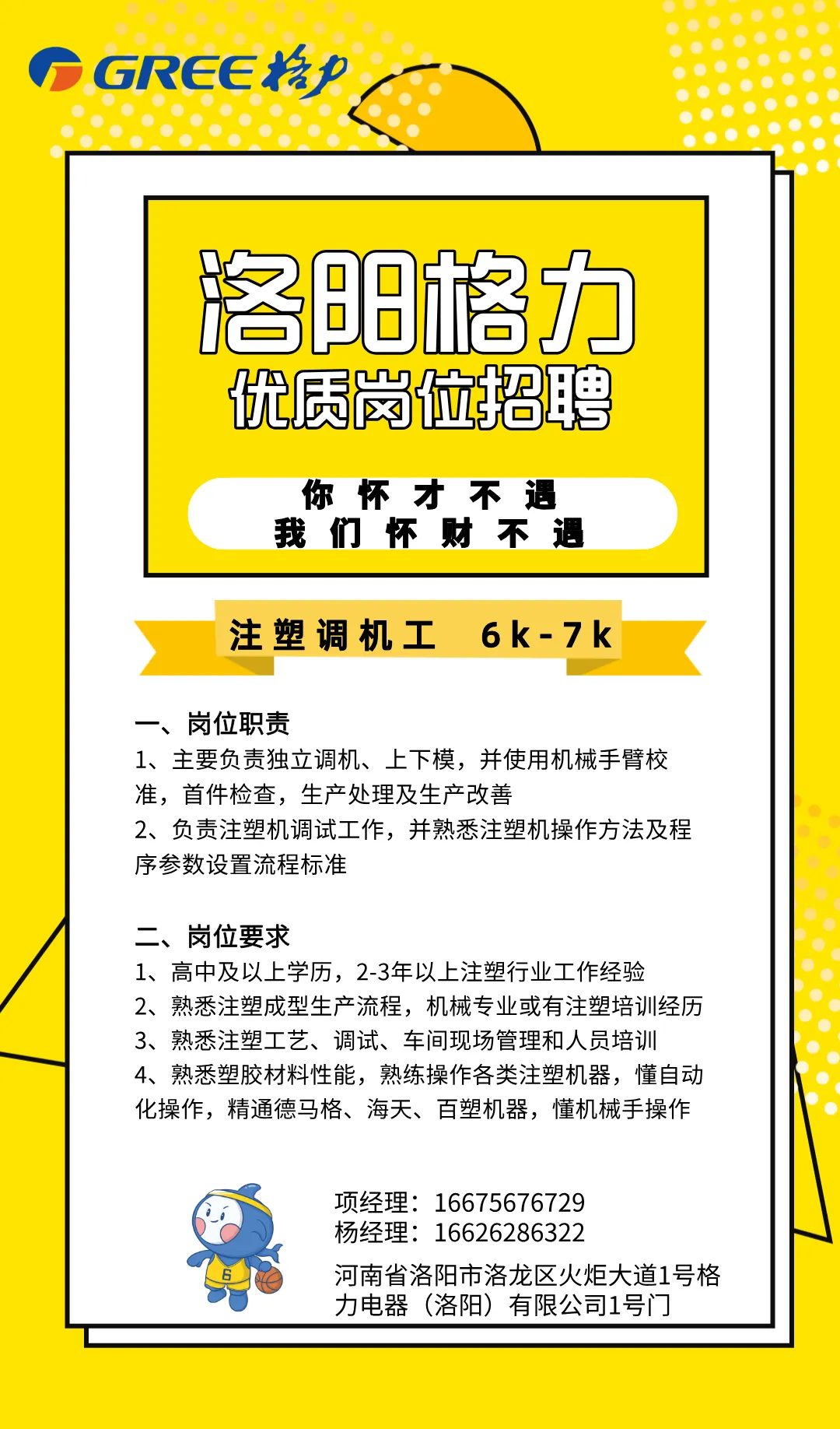 【洛阳格力】五险一金 | 技工补贴 洛阳格力2026注塑机调试工岗位长期招聘!