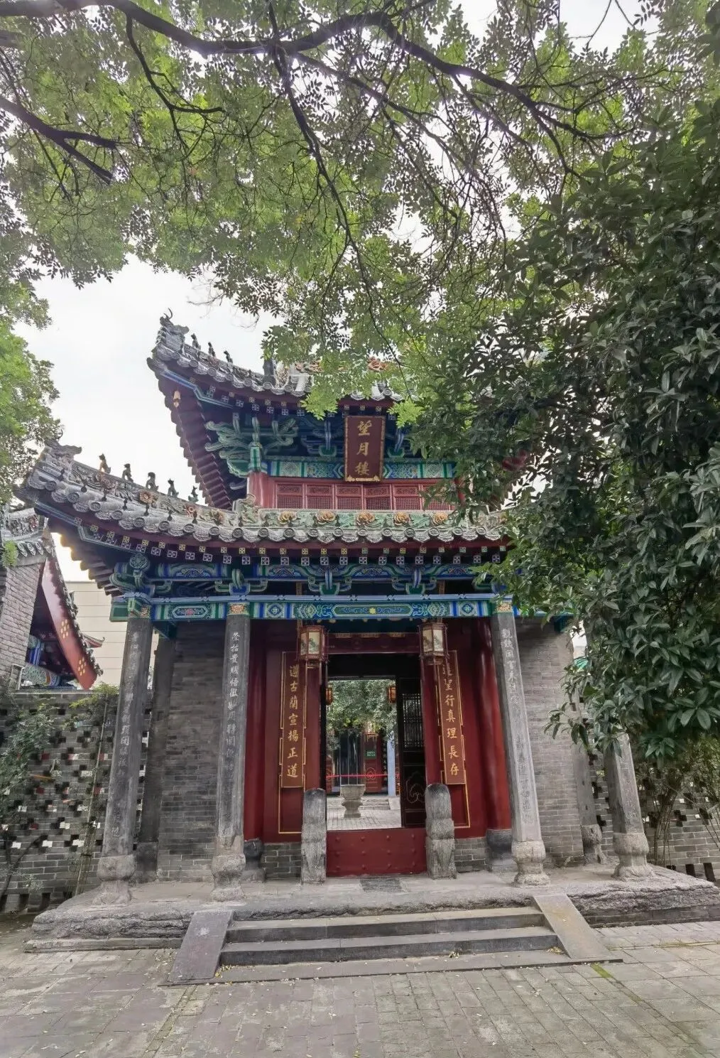 望月楼为明代二层建筑,重檐歇山式屋顶翘角飞檐,超有中式古韵,檐下 “万化朝真” 匾额藏着往昔故事,四角还挂着风铃。