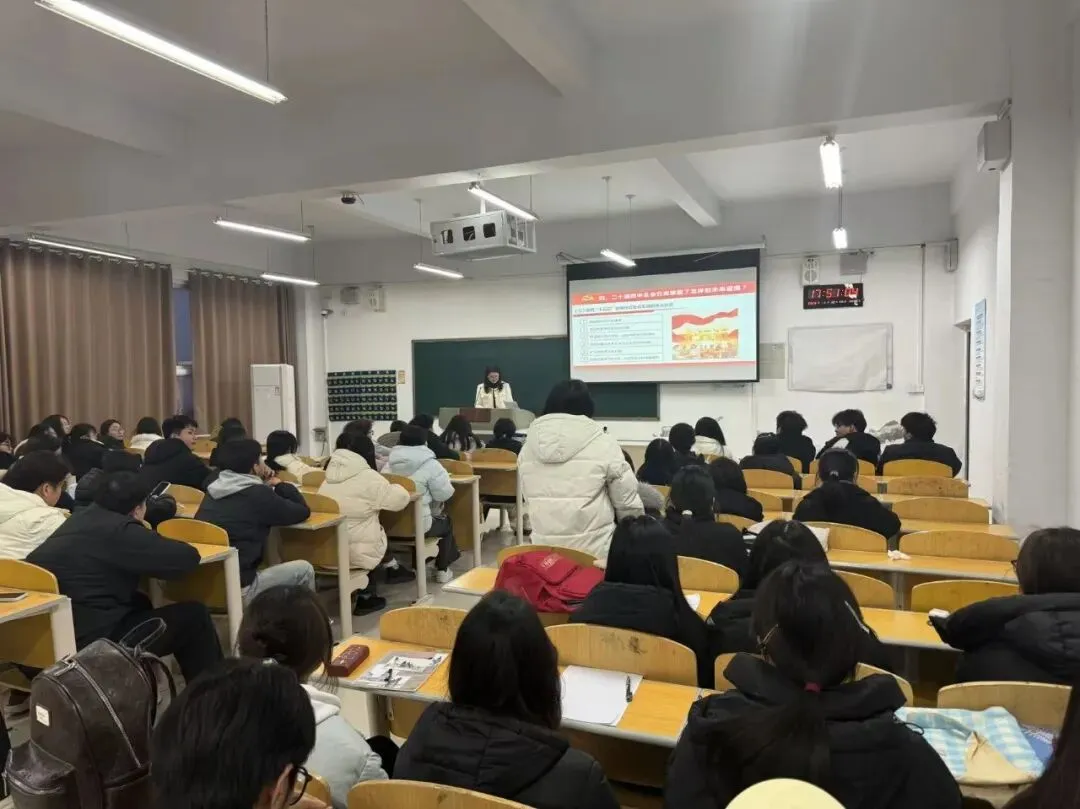 为深入学习贯彻党的二十届四中全会精神,2026年1月12日,数字经济学院学生党支部以“深悟党的二十届四中全会精神实质,扛起‘十五五’奋进新使命”为主题开展专题党课。学院24年度、25年度入党积极分子参加学习,共同凝聚奋进力量、明确前行方向。