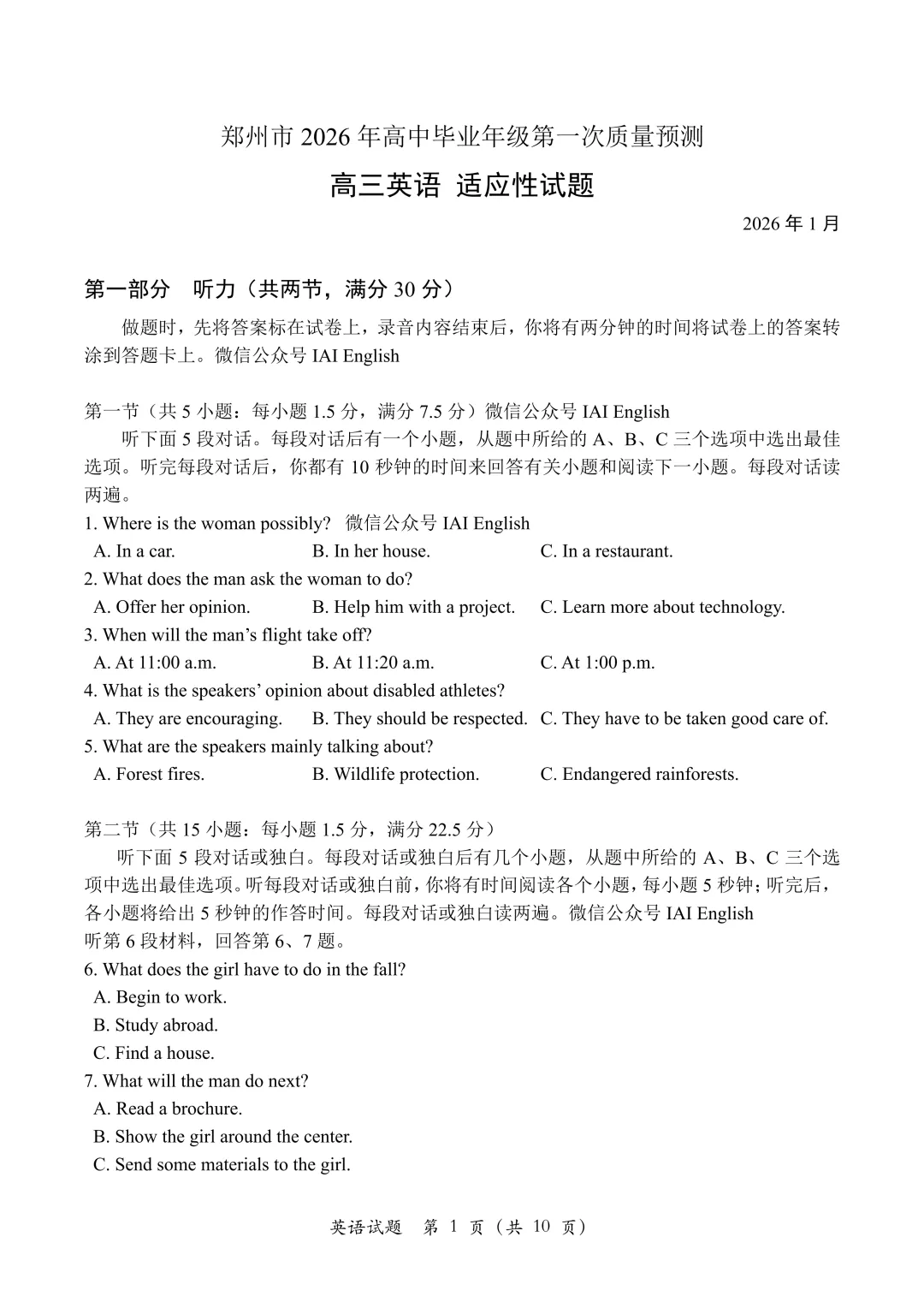 >【2026模拟题】361. 郑州市高三第一次质量预测英语试题+答案