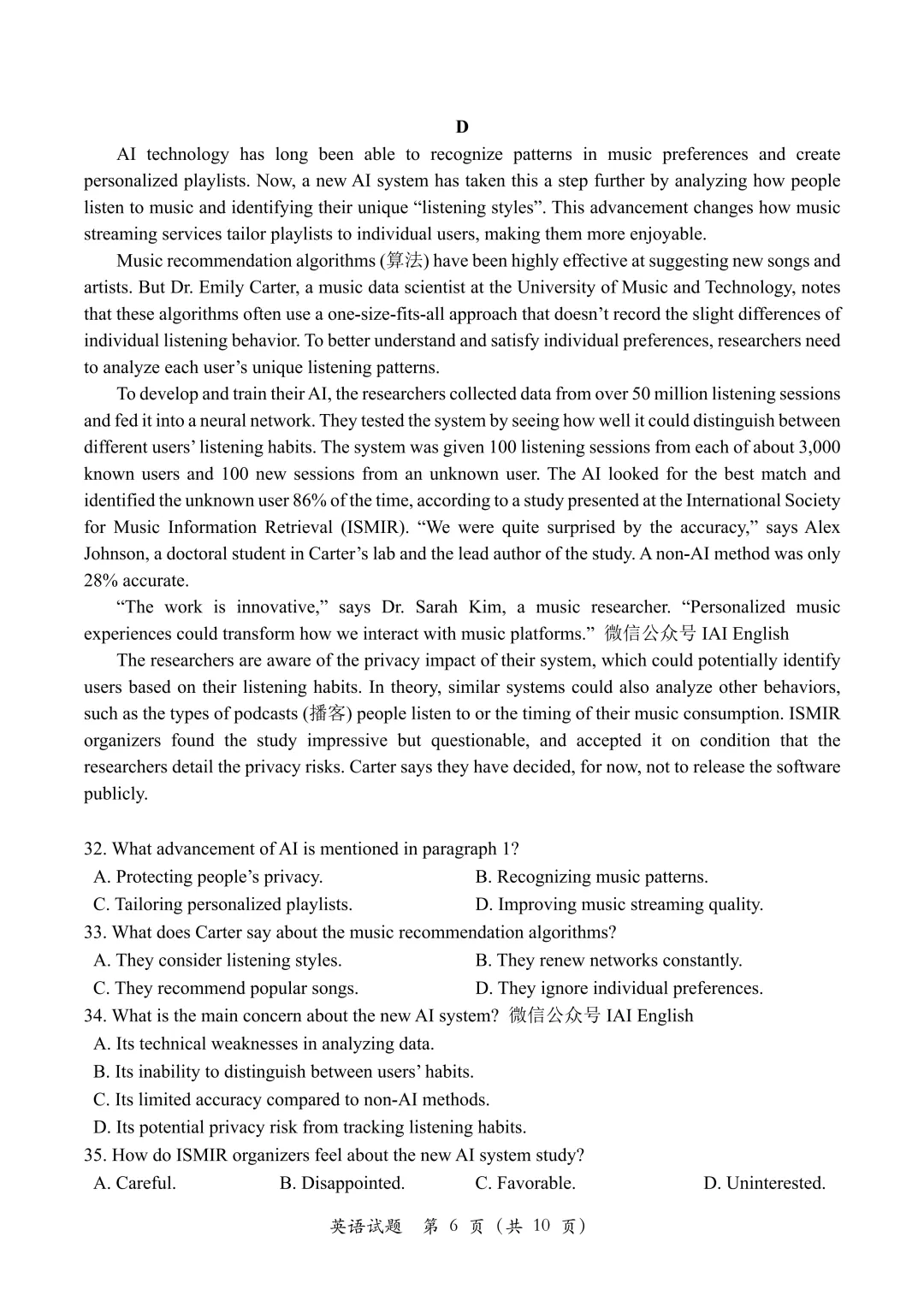 【2026模拟题】10. 湖南省长沙市雅礼中学高三月考(一)英语试题+答案