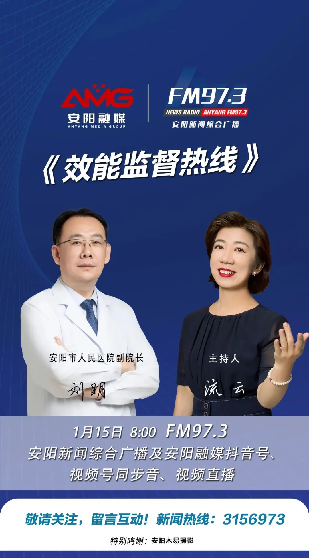 1月15日8:00,安阳市人民医院副院长刘明做客新闻综合广播《效能监督热线》。节目将通过FM97.3安阳新闻综合广播及安阳融媒抖音号、视频号同步音、视频直播。敬请关注,留言互动!