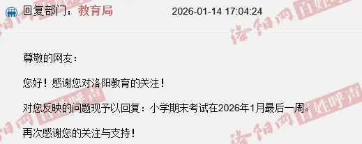 您好!感谢您对洛阳教育的关注!对您反映的问题现予以回复:小学期末考试在2026年1月最后一周。