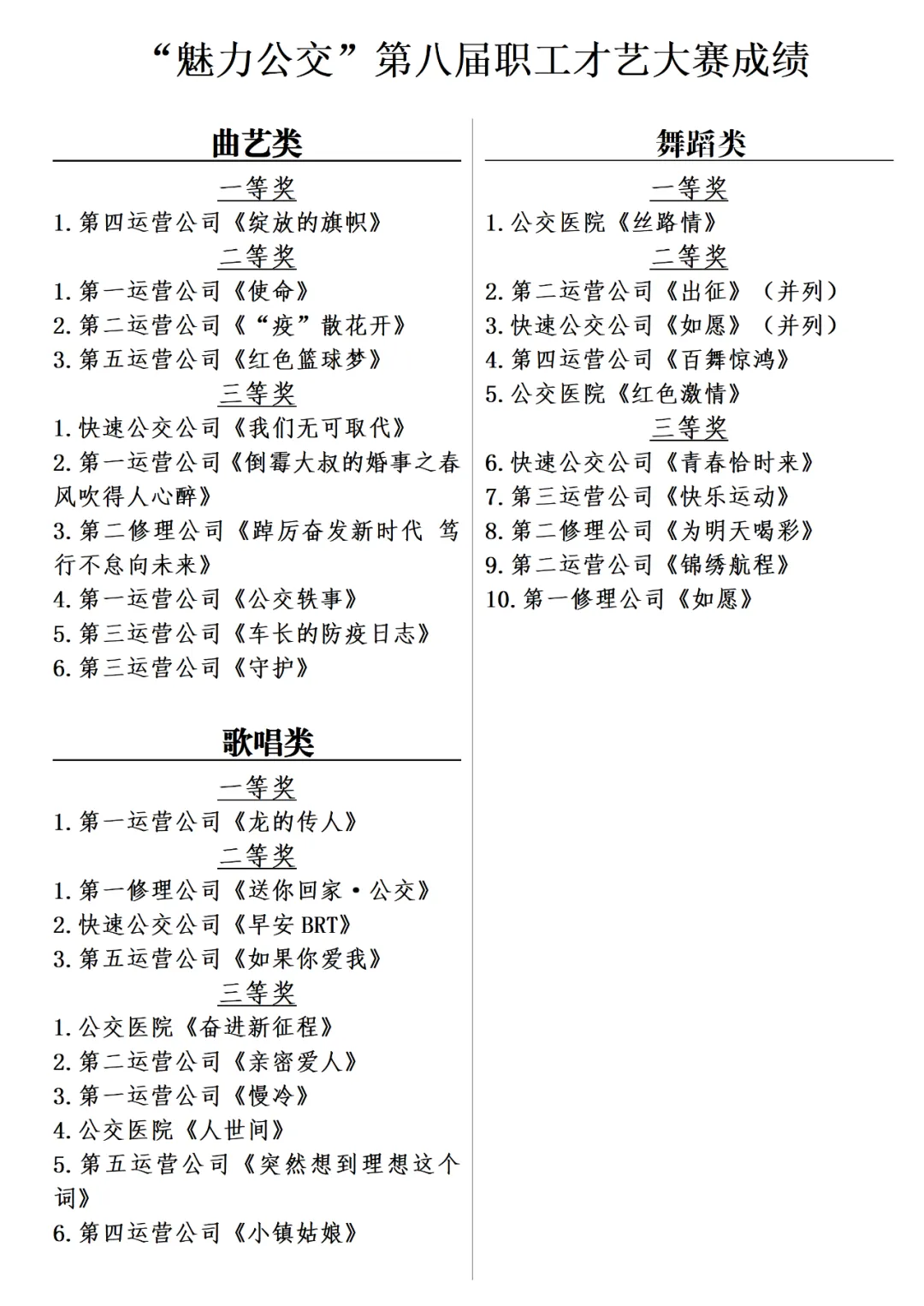 为了保证本届大赛的公平公正,集团公司工会邀请了中宣部十三届五个一工程奖获得者、郑州市总工会宣教部副部长陈红松,河南省青年女高音歌唱家、河南省音协会员牧敏,河南电视台大型活动部舞蹈编导、星光大道、非常6+1、梦想中国等多个央视文艺节目编导黄佩,集团公司宣传部部长张蕾,集团公司团委副书记李佳佳五位专业评委为参赛选手打分。上午9点,大赛在笛子演奏《青藏高原》慷慨激昂、振奋人心的氛围中拉开帷幕,清脆的笛声高亢激扬,带人领略雪山天籁;大管独奏《海阔天空》展现公交人胸中的大气、豪气、浩气和正气;古典吉他独奏《爱的罗曼史》以乐曲优美纯朴的旋律与清澈的分解和弦完全溶为一体,优雅浪漫、极致迷人;唢呐演绎的经典老歌《十五的月亮》吹出了生活的酸甜苦辣,旋律优美,韵味十足;钢琴《但愿人长久》典雅、温柔又多情,极富有浪漫主义色彩。在阵阵优美的器乐中演绎出古典与现代的碰撞,让人耳目一新又陶醉其中。曲艺节目中,小品《疫散花开》讲述了公交人奋斗疫情一线,在平衡家庭与工作之间趣味生活;相声《比聪明》中一对可爱的公交人相互拆台,却在欢笑中让大家共同提高了公交服务意识;豫剧《倒霉大叔的婚事》作为地方戏曲中的典型代表作,在公交人专业级演唱水准中将戏曲文化发扬光大;杂技《红色篮球梦》展现出公交人的花式篮球技艺,小品《我们无可取代》讲述了5G智能公交的发展为百姓出行带来的舒适与便捷,让城市更有温度;相声《车长的疫情防控日志》用生动的表演让大家看到了一个公交车长在疫情防控工作中如何巧妙服务乘客的情景;情景剧《绽放的旗帜》展现了公交人争做时代新人,传承红色基因的昂扬精神面貌;小品《逆行者》讲述了一对公交小夫妻在磕磕绊绊中又相互支持各自的工作的幸福生活;小品《使命》讲述了逆行的公交人直面疫情,用担当诠释企业责任,用使命演绎出新时代最美风景;乐小品《中原大饭店》诙谐幽默,说出了咱们河南人爱河南、争做河南榜样的共同心声;小品《守护》讲述了相亲相爱的公交职工的为了去支援港区经济建设而相互加油鼓劲;小品《公交轶事》生动幽默的展现了公交车内乘客与特殊人群之间的关怀关爱;快板《踔厉奋发新时代 笃行不怠向未来》用简明的板词、嘹亮的声音、欢快的节奏唱响党的二十大精神。在紧接着下午的歌舞比赛中,歌唱类节目,歌曲《这世上那么多人》温暖深情的演唱颇具独特气质,真情流露的歌词唱出了对人生的态度,对生活的理解,让人跟随旋律引起共鸣;歌曲《天路》优美的旋律让人感动,让人激动,让我们再一次见证“天路精神”,饱满深情而有温度的演唱,让人激情飞扬、信心倍增;歌曲《人世间》动人心弦的旋律让人一起感动、一起怀念、一起憧憬、一生向阳;歌曲《中国人》震撼有力的节奏、意气风发的斗志唱出了中华五千年文明史的厚重,无论多少风雨、多少苦难都压不倒我们中国人,我们的中国精神;歌曲《早安BRT》充满动感的旋律让现场掌声沸腾,“你是那夜空中最亮的星星,照亮我一路前行;你是我生命中最美的相遇,你若安好便是晴天”,唱出了对企业的热爱和深深的家国情怀,唱到了全体公交人的心灵深处;歌曲《奋进新征程》激昂向上的旋律、甜美悠扬的歌声,唱出了对党、国家和社会主义的热爱,引领大家在新的一年里踔厉奋发、勇毅前行,以党的二十大精神为引领,凝心聚力推动郑州公交高质量发展、同心共筑中国梦;歌曲《送你回家》让人感受到郑州公交的温度,风霜雨雪、披星戴月,公交人一如既往陪伴在您左右,您的安全顺利到达,万家灯火、阖家团圆就是万名公交人的共同心愿。歌唱类节目在一曲红色歌曲《绣红旗》中结束,演员身穿“江姐”的服装,唱出了革命先烈崇高的大无畏精神,激发现代人新时代新征程用心作为。舞蹈类节目中,舞蹈《红色激情》用闪亮的党员徽章、鲜红的国旗表达出深深的家国情怀,演员们一身中国红,娇美的面容、帅气的脸庞,优美的舞姿,把对美好未来的向往表达得淋漓尽致;舞蹈《出征》,展现了郑州公交出征港区,驻守港区,无恙归来的国企担当,一个个公交人手握方向盘,出征战疫最前线,他们的勇毅前行、他们的义无反顾,让人为之动容,一个个铿锵有力的舞姿表达出战疫必胜的信念,体现了郑州公交深刻践行“坚持发展、创造满意、服务乘客、奉献社会”的企业使命;舞蹈《快乐运动》整齐划一的动作、充满动感的节奏,活力四射、激情飞扬,展示出公交人对运动的痴迷,对生活的热爱,提醒公交人一定要劳逸结合、加强自我健康管理意识,以更加饱满的热情、更加积极的态度、更加用心的作为拥抱崭新的明天;舞蹈《锦绣航程》展现了公交人对党的二十大精神的深刻领会和对未来的无限期许;舞蹈《如愿》,从枪林弹雨、浴血奋战、抛头颅洒热血的革命年代到人民安居乐业、国家繁荣昌盛的现世,演绎出革命的斗志和青春的热血,正是一辈辈革命先烈的奋斗与奉献,给大家创造了现在更好的环境和生活,号召大家继承革命遗志、传承红色精神,建设更加美好灿烂的明天;舞蹈《丝路情》,一个个仙女犹如从壁画走来,优美的舞姿、动人的旋律,引领我们在新的丝绸之路上书写新时代新篇章。经过一天近8个小时的激烈角逐,最终“魅力公交”第八届职工才艺大赛成绩如下