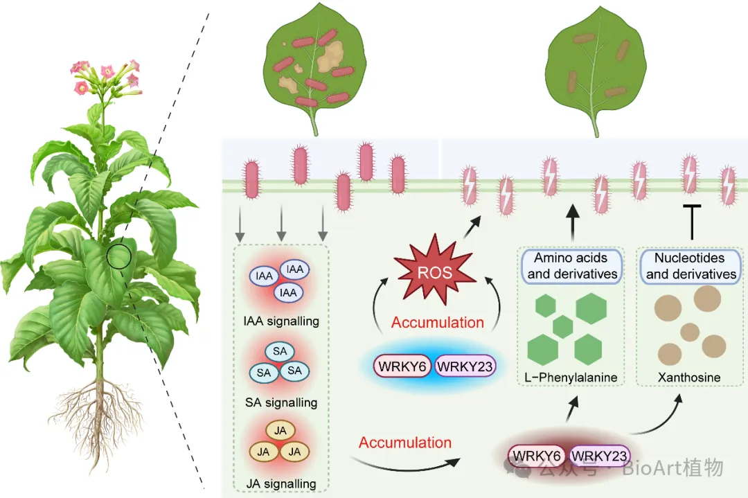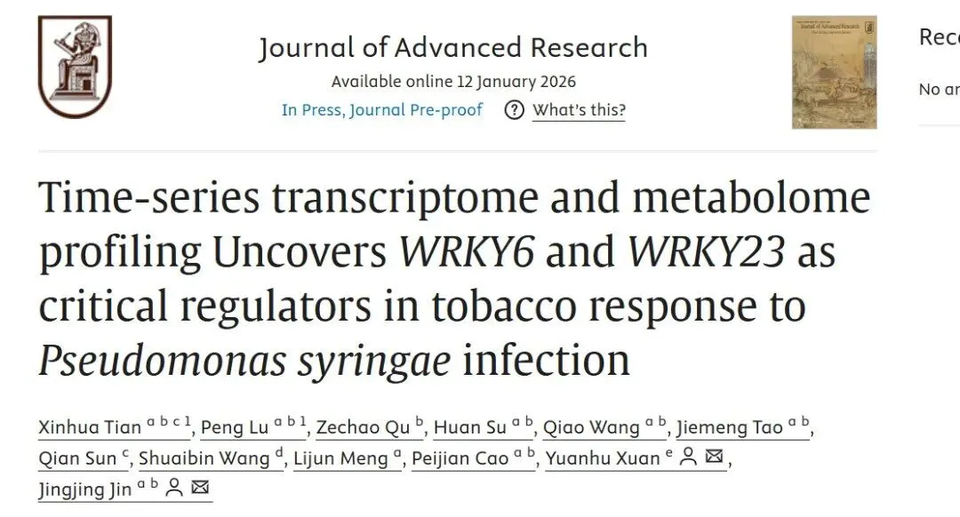 近日,郑州烟草研究院金静静团队在国际综合性期刊Journal of Advanced Research上在线发表了题为Time-series Transcriptome and Metabolome Profiling Uncovers WRKY6 and WRKY23 as Critical Regulators in Tobacco Response to Pseudomonas syringae Infection的研究论文。该研究以栽培烟草为模式植物,首次整合了高分辨率的时间序列转录组和代谢组数据,深入揭示了烟草在遭受“野火病”(由丁香假单胞菌引起)侵染过程中分阶段、动态的防御策略。研究团队成功鉴定出两个关键的转录因子—WRKY6和WRKY23,并初步解析了它们在烟草抵抗病原菌入侵中的核心调控机制。