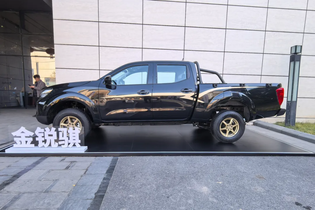 来到侧面,金锐骐仍然是高大威猛的皮卡造型,敦实的车身与硬朗的线条呈现出颇有张力的越野气息。同样,新车通过金色轮毂展现金锐骐的身份,带来了更明显的高级感。