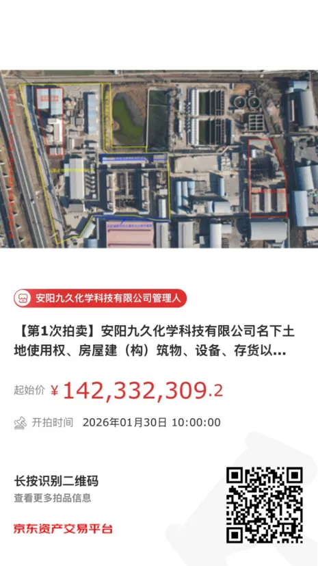 拍卖标的:安阳九久化学科技有限公司名下土地使用权、房屋建(构)筑物、设备、存货以及商标等资产(具体以资产评估报告为准,并请关注拍卖公告特别列明事项)拍卖日期:2026年1月30日10时至2026年1月31日10时止(延时除外)1、竞买公告、竞买须知、资产评估报告等相关文件已在拍卖平台公开展示,请仔细阅读相关内容。安阳九久化学科技有限公司成立于2013年5月27日,因资不抵债被安阳市中级人民法院裁定受理破产清算,安阳市中级人民法院依法指定河南文丰律师事务所为管理人。2025年11月25日,安阳市中级人民法院裁定宣告安阳九久化学科技有限公司破产。 编辑 | 宋卓远