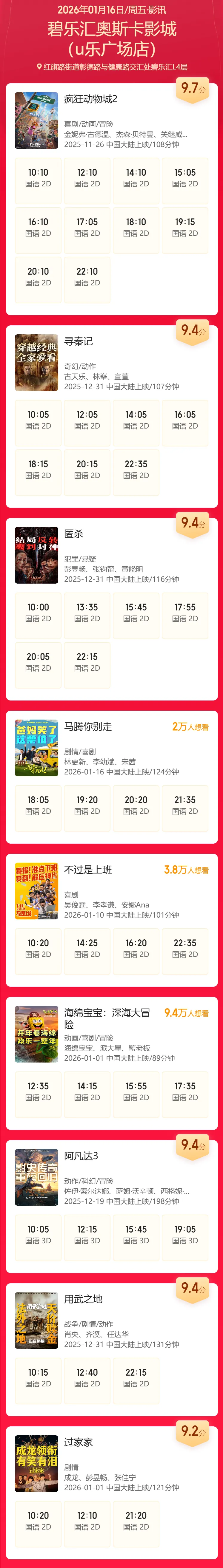 安阳碧乐汇奥斯卡影城1月16日影讯(影讯仅供参考,具体排片以影院当日播出为准)