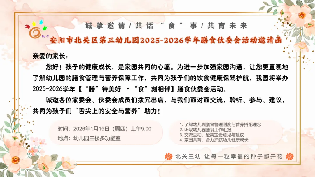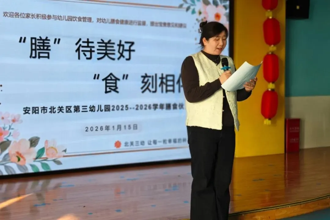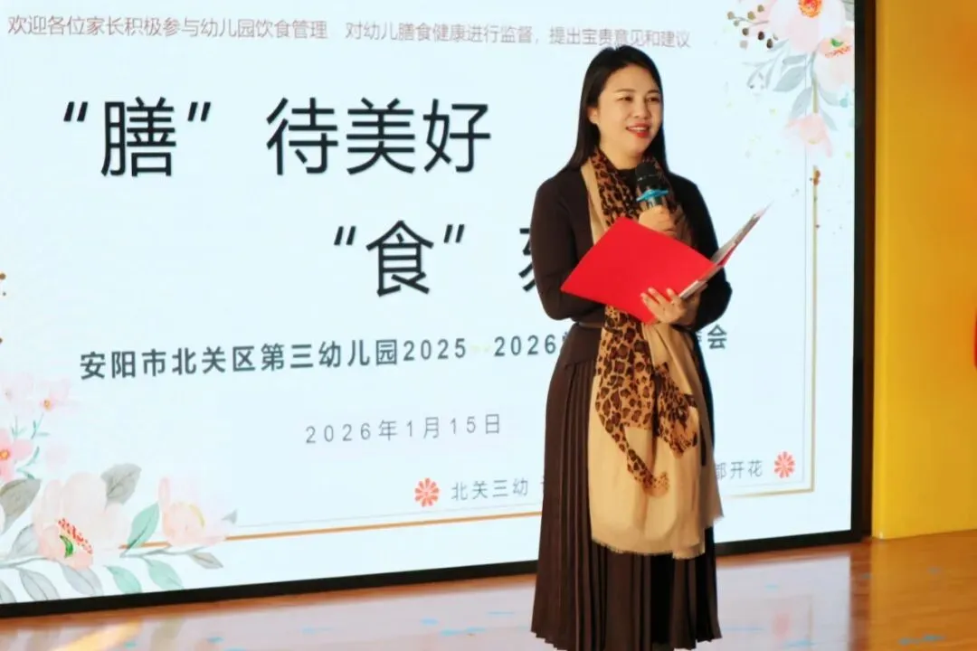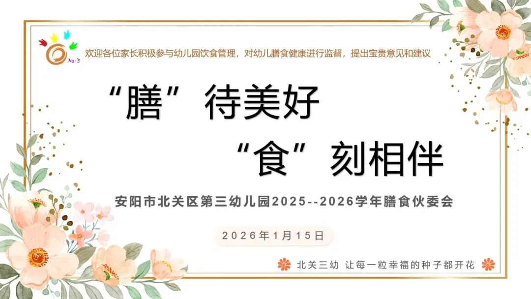 为凝聚家园共育合力,深化膳食管理与服务,共同守护幼儿健康成长,2026年1月15日上午,安阳市北关区第三幼儿园成功召开了【“膳”待美好·“食”刻相伴】膳食伙委会活动。活动旨在增进家长对幼儿园饮食管理工作的了解,听取宝贵意见,携手共筑科学、营养、安全的幼儿健康饮食环境。
