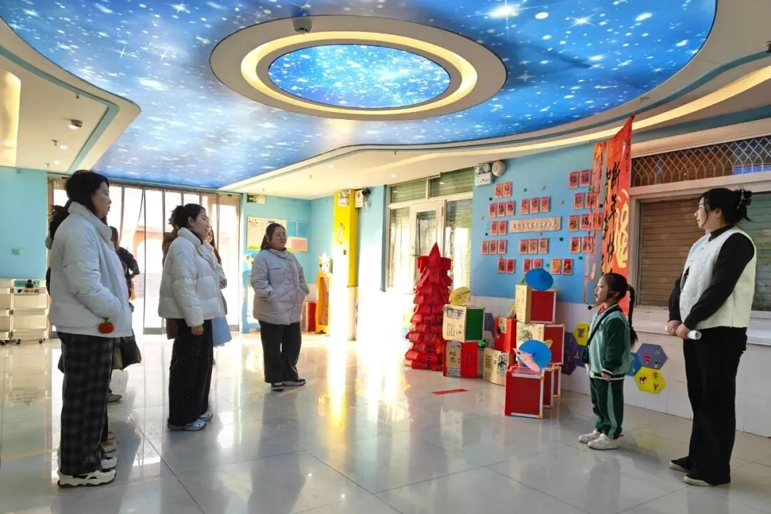 在文化大厅,大一班小小讲解员姜语彤用稚嫩而自豪的声音介绍:“抬头看是一片美丽的星空,园长妈妈说我们就像小星星,每个人都亮晶晶!”