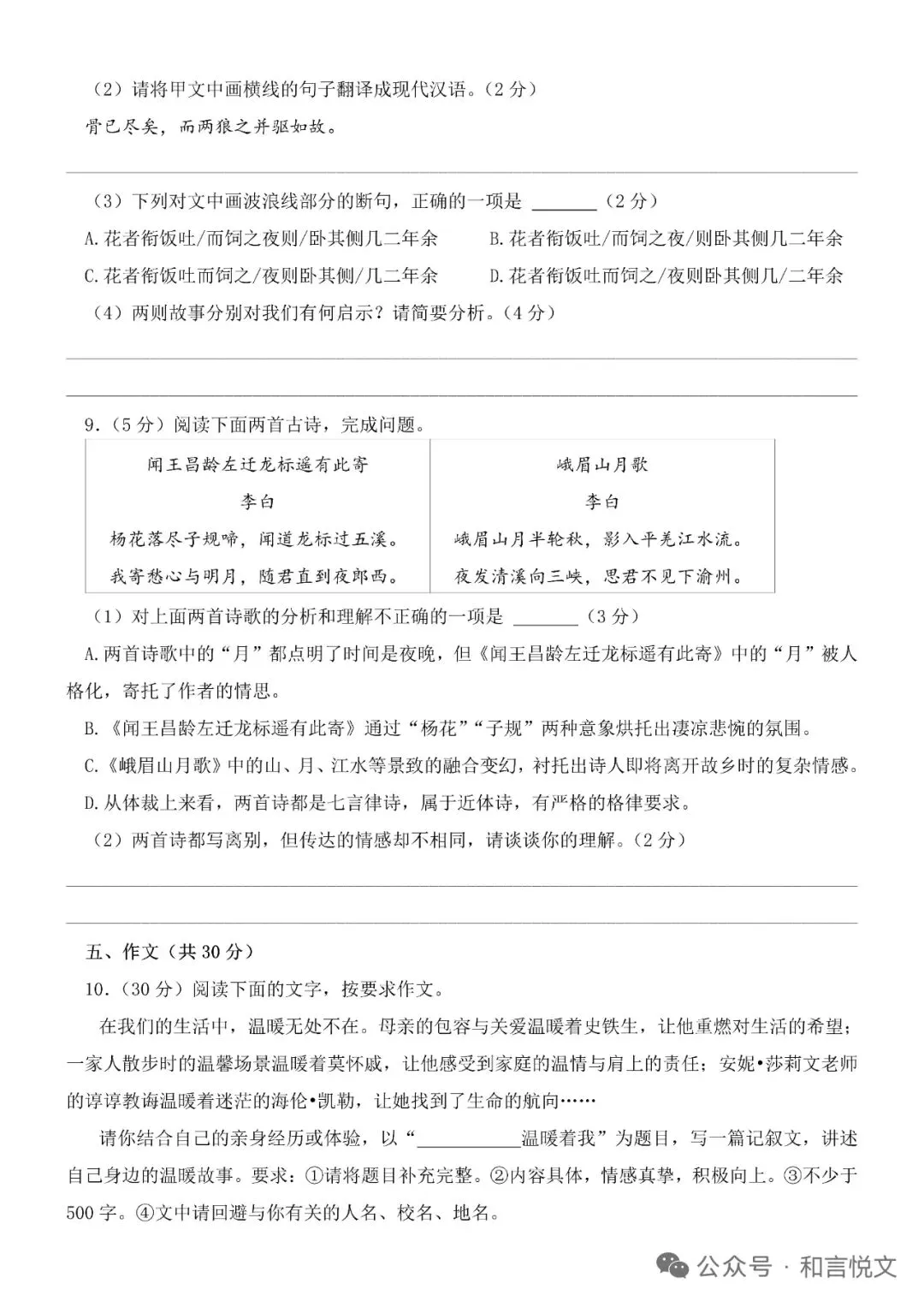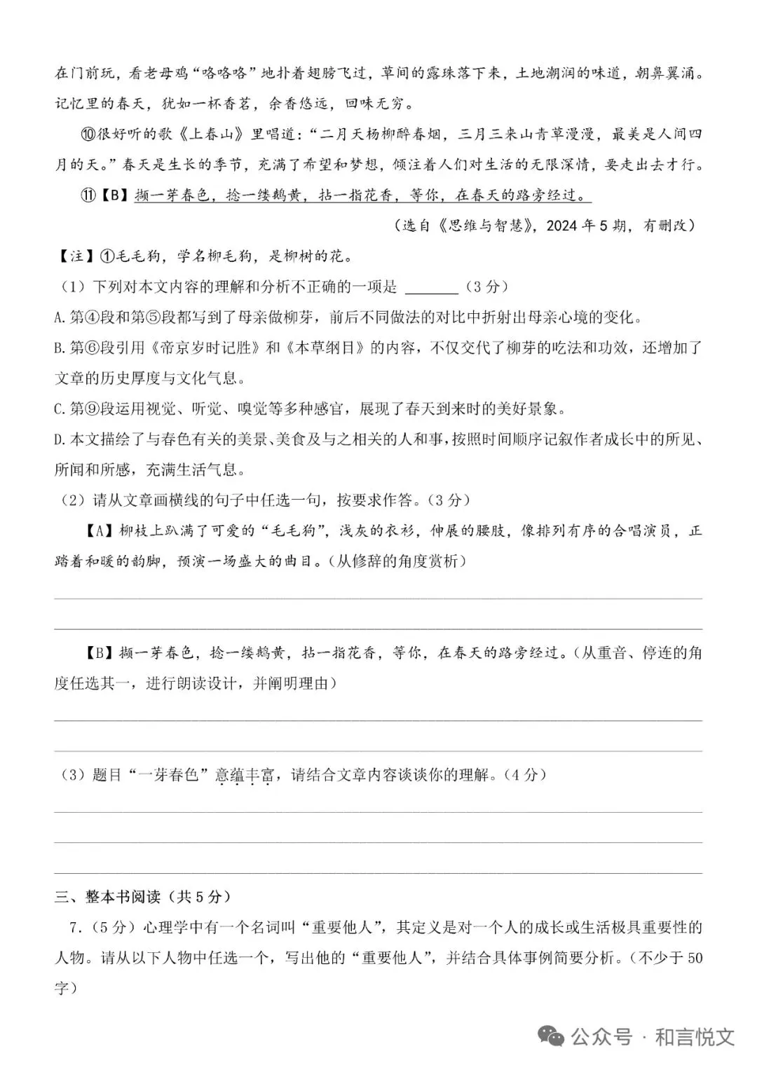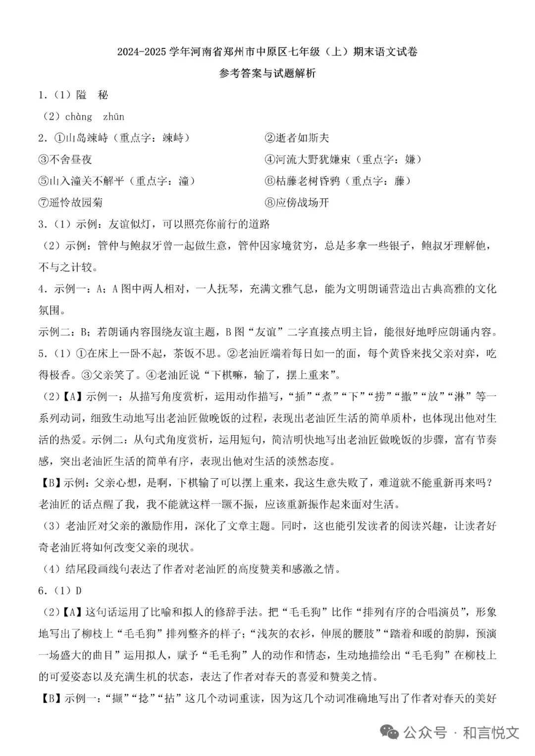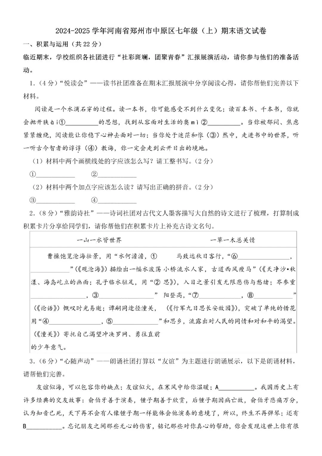 2024-2025河南省郑州市中原区七上语文期末试卷+答案