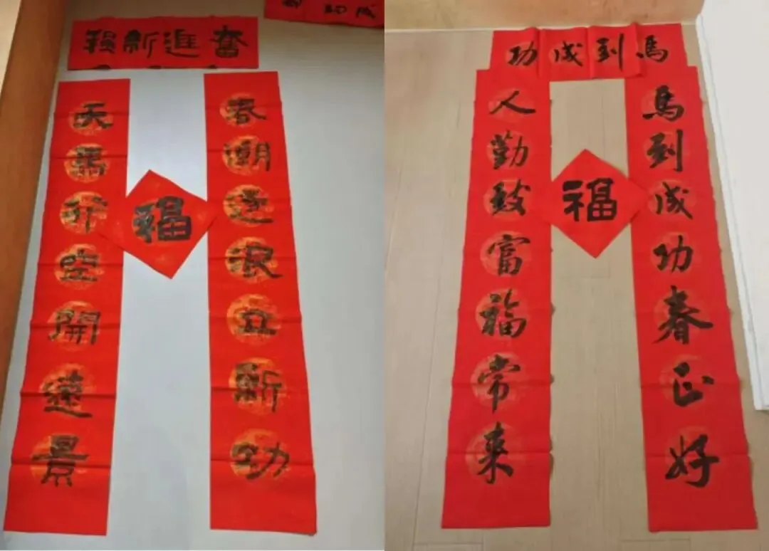 在随后的“写春联、送福字”环节,石品率先挥毫,笔走龙蛇,一副副寓意吉祥的春联和“福”字跃然纸上。老师们也各展其才,行、楷、隶书各具风采。居民们环绕桌前,一边欣赏精湛技艺,一边挑选心仪联句。“骏马奋蹄迎盛世,春风得意启新程”“福旺财旺运气旺,家兴人兴事业兴”……美好的祈愿化作淋漓墨迹,承载着师生对居民最真挚的新春祝福。手捧墨香馥郁、祝福满满的春联,居民们笑容洋溢,纷纷表示手写春联比印刷品更有温度、更有年味,感谢美院老师送来如此珍贵的新年礼物。