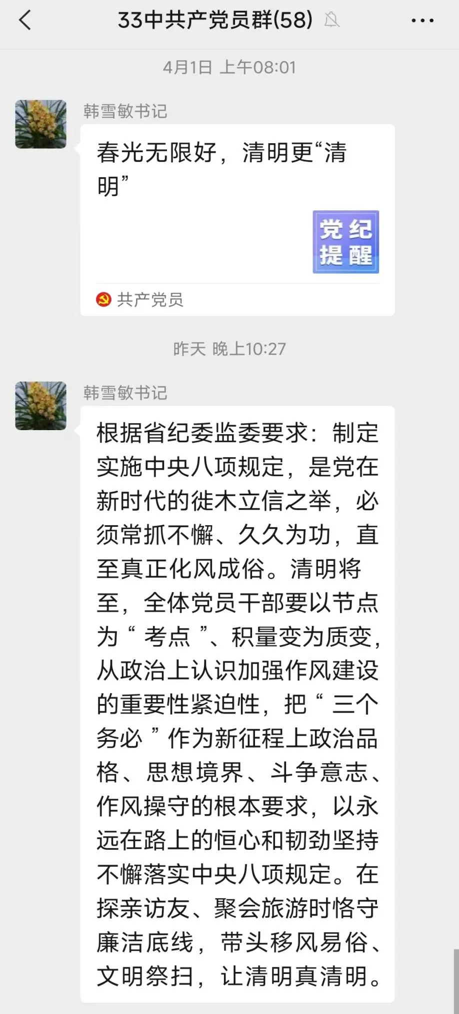 4月1日,在清明节来临之前,韩雪敏书记对全体干部做出党纪提醒,要求全体党员干部要以节点为“考点”、积量变为质变,从政治上认识加强作风建设的重要性紧迫性,把“三个务必”作为新征程上政治品格、思想境界、斗争意志、作风操守的根本要求,以永远在路上的恒心和韧劲深入贯彻中央八项规定精神。在探亲访友、聚会旅游时恪守廉洁底线,带头移风易俗、文明祭扫,让清明真正清明。