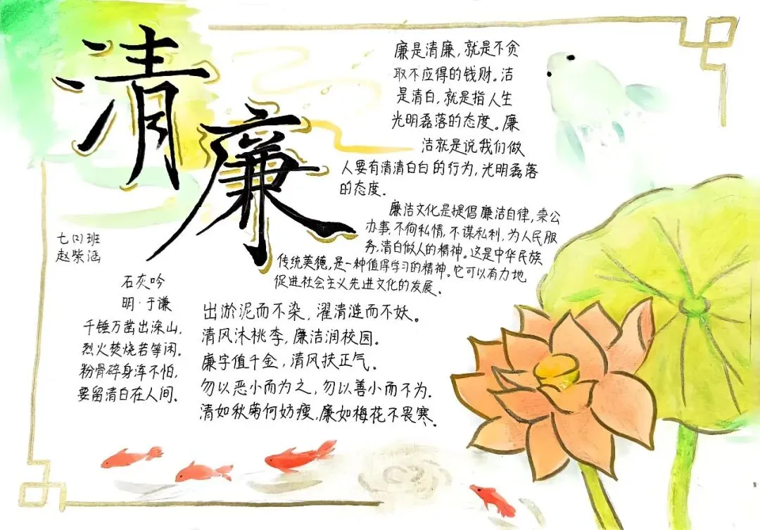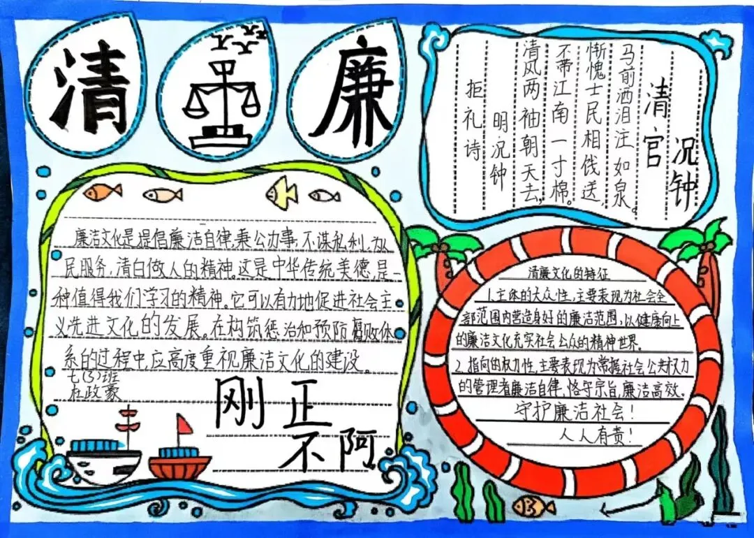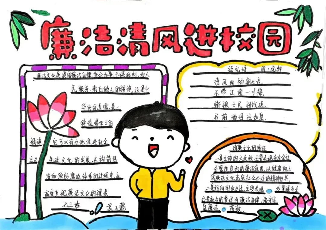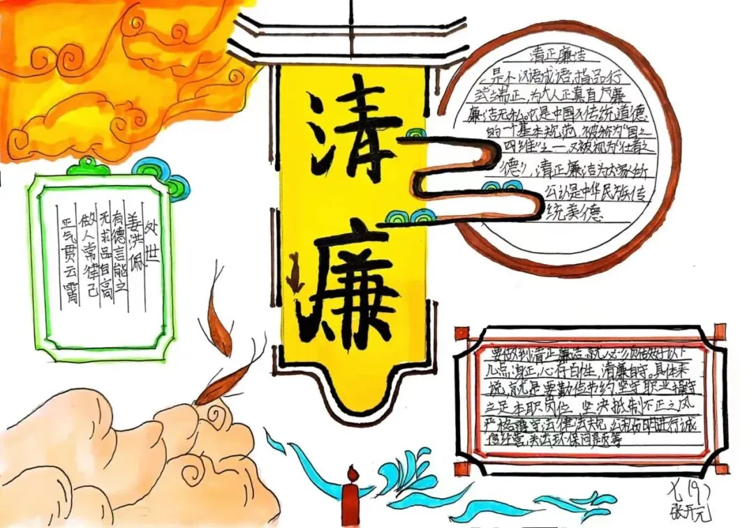 为深入推进清廉学校创建,营造校园廉洁文化氛围,我校通过开展"清风润校园 廉韵启新程"清廉主题手抄报活动,对学生进行廉洁自律的渗透、熏陶与引导,教育学生在日常学习生活中,要诚实守信,正直勤俭。