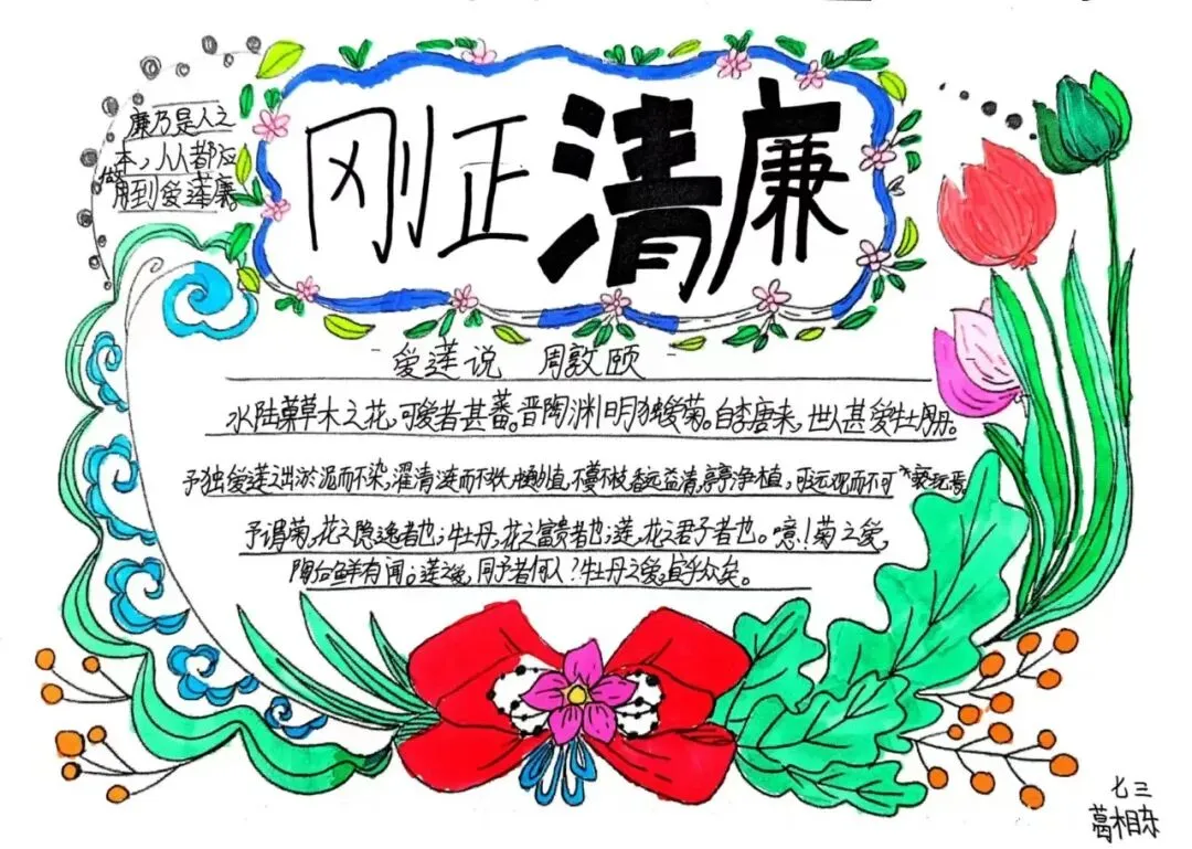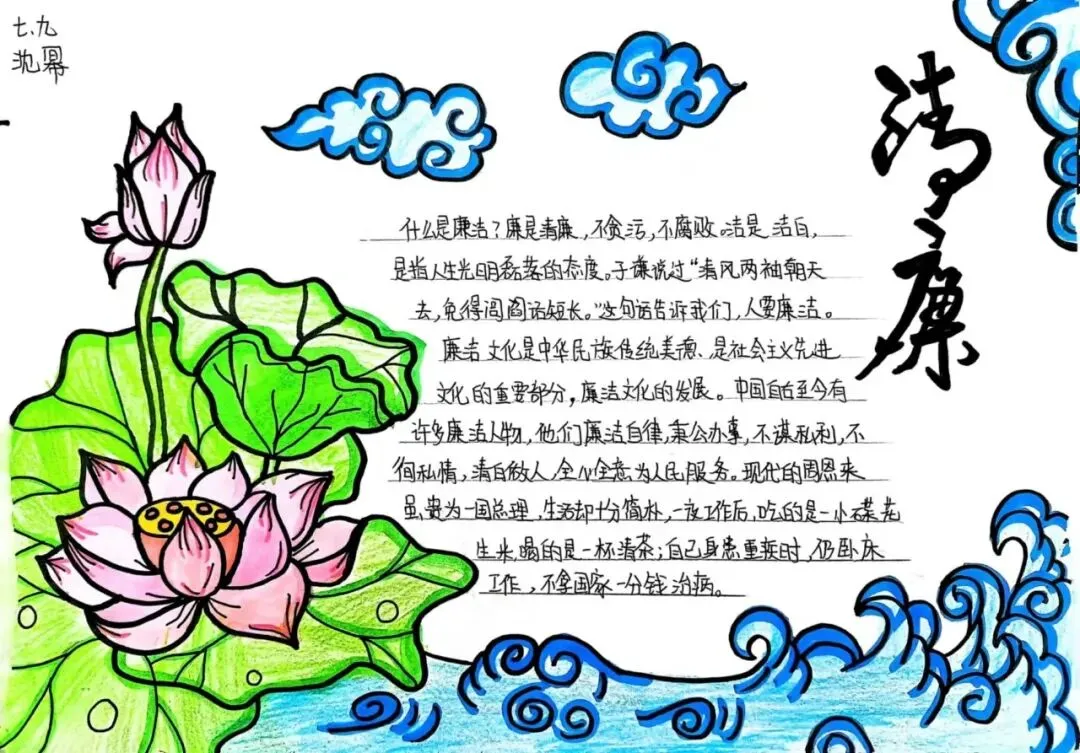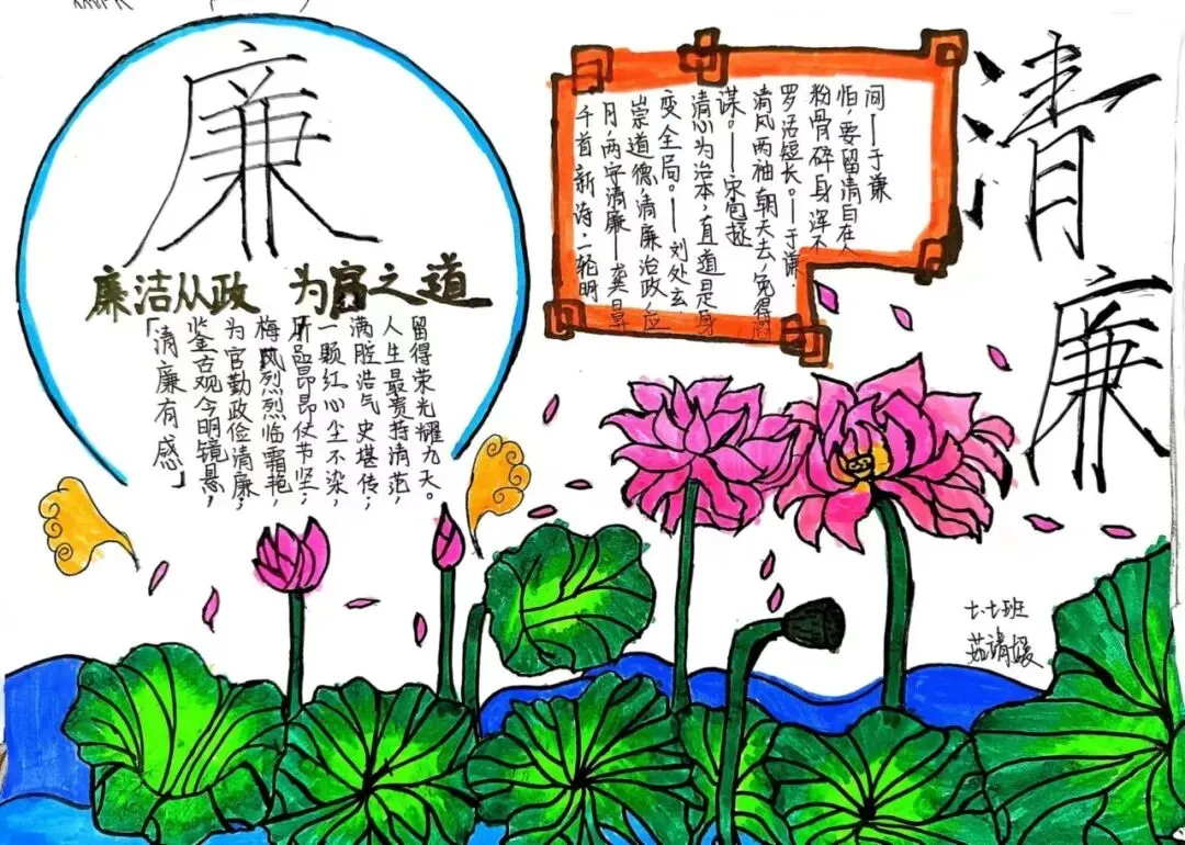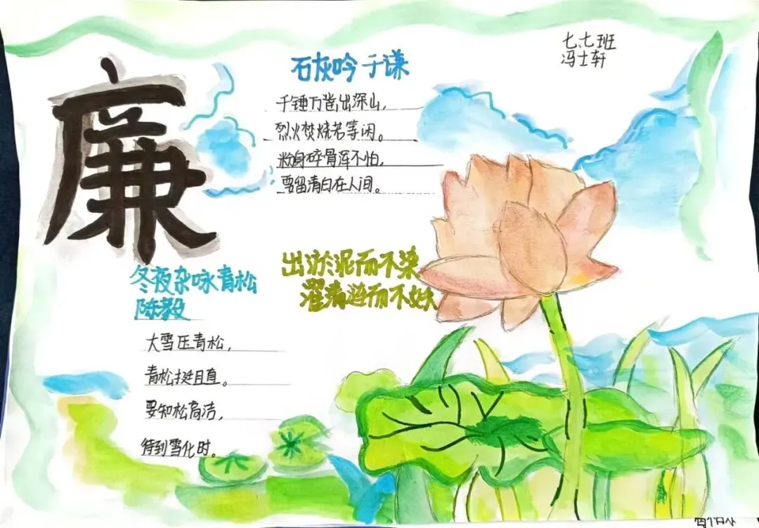 为深入推进清廉学校创建,营造校园廉洁文化氛围,我校通过开展"清风润校园 廉韵启新程"清廉主题手抄报活动,对学生进行廉洁自律的渗透、熏陶与引导,教育学生在日常学习生活中,要诚实守信,正直勤俭。