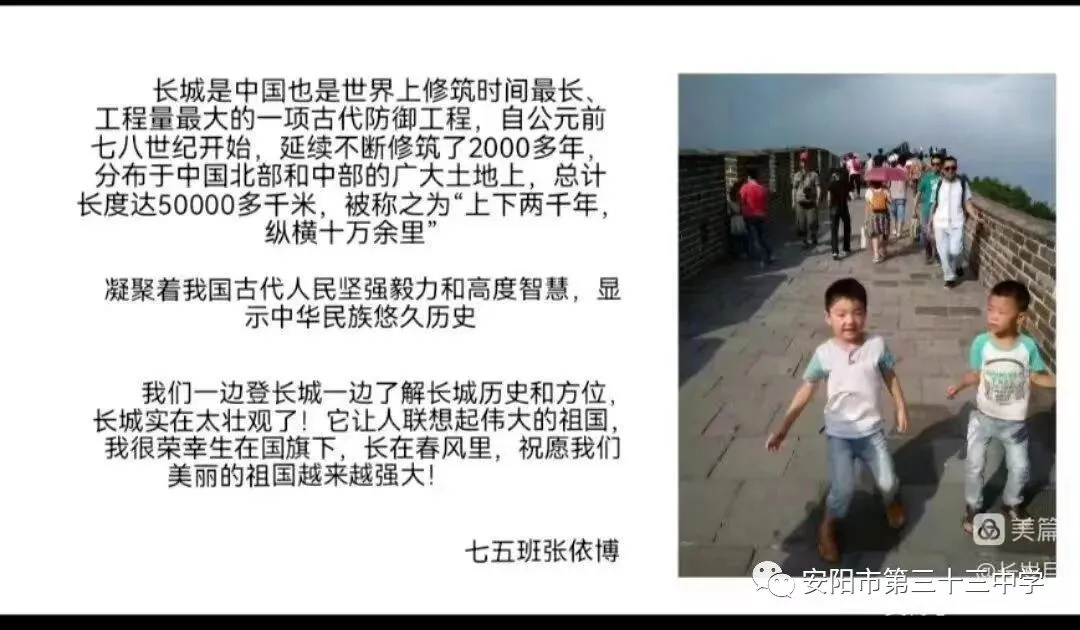 登长城窥象,观风云百年。同学们在相册里寻找曾经的足迹,感慨伟大的祖国地大物博,幅员辽阔。