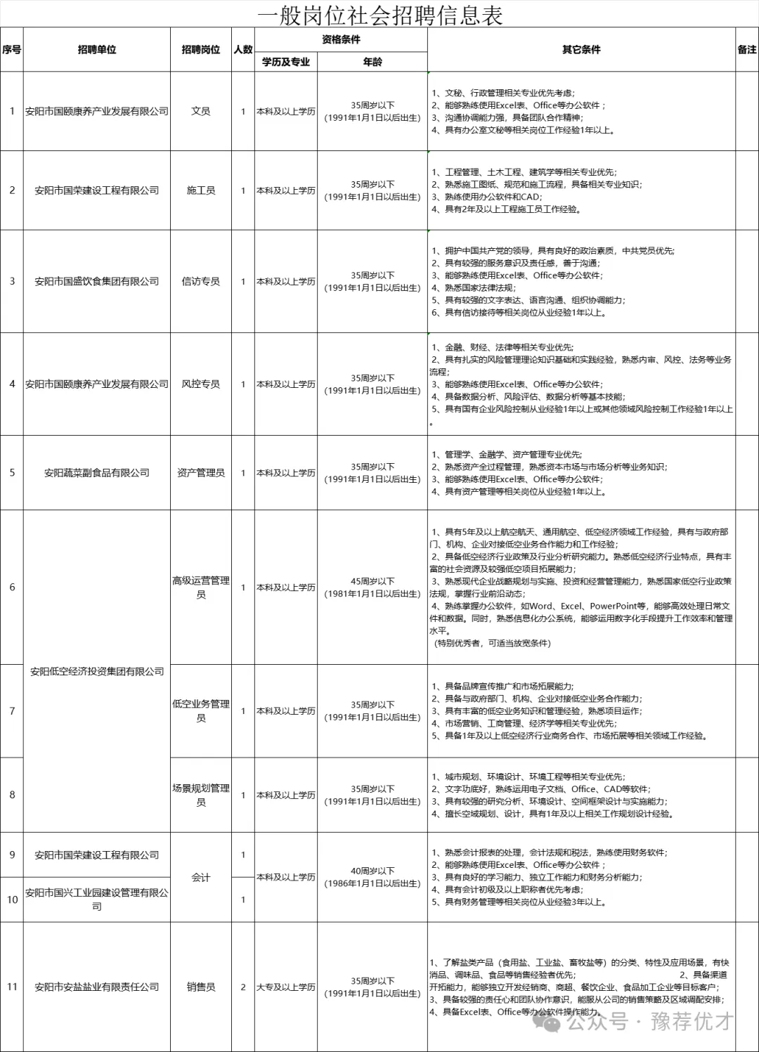 安阳市国控集团有限公司是安阳市委、市政府批准设立的市管骨干企业,功能定位是:服务国企改革、投资运营乡村振兴、城市民生、低空经济等方面业务。主体信用等级AA+(产业类),近年来,为我市经济转型发展作出了积极贡献。为深入践行人才强企战略,充分契合集团公司高质量发展需求,秉持公开、公平、公正、择优录用原则,现面向社会公开招聘一般岗位工作人员12名。相关事宜公告如下: