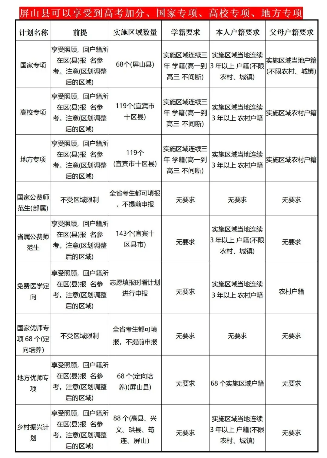 根据2021年12月出台的《屏山县户口迁入登记管理办法》,在我校就读的学生,可将学生户籍迁入屏山。依据四川省相关特殊招生优惠政策,在屏山县具有连续三年完整户籍、三年求实高中的学籍和实际就读,并在求实高中参加高考的考生,均可享受“国家专项计划”(单列指标、单独填报、单独录取)、“高校专项计划”、“少数民族待遇县加分政策”等多项政策。