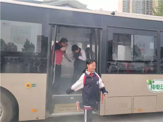 演习开始,同学们手捂口鼻、弯腰低身、沉着冷静地跟着工作人员赵冰迅速跑下公交车。