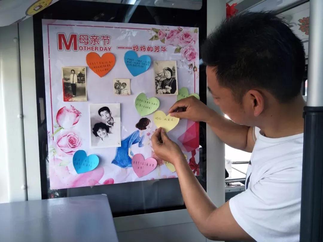 “儿女的脚步走的再远,也走不出母亲的呵护!值此母亲节之际祝我的妈妈平安健康!”“妈妈身体健康才是最重要的,钱不要省着,你要好好吃饭,多出去旅旅游,想你,爱你!”……母亲节来临之际,全国敬老文明号52路车长们在公交车内的展板上贴满了车长母亲年轻时的照片和祝福的话语,打造了一个温馨的场所。一张张黑白泛黄的照片,一枚枚五颜六色的心愿贴纸,传递着最贴心的表达,吸引了众多市民乘客的参与。