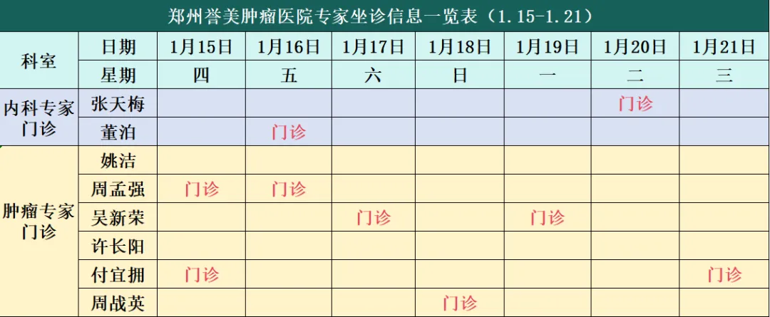 【本周专家预告】郑州誉美肿瘤医院1月15日-1月21日专家坐诊安排来啦!