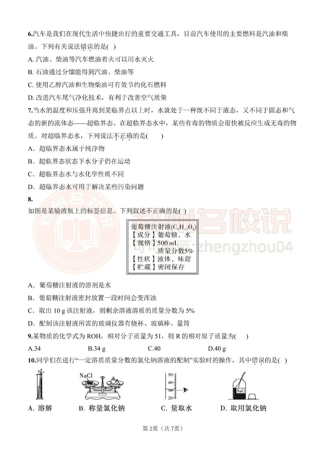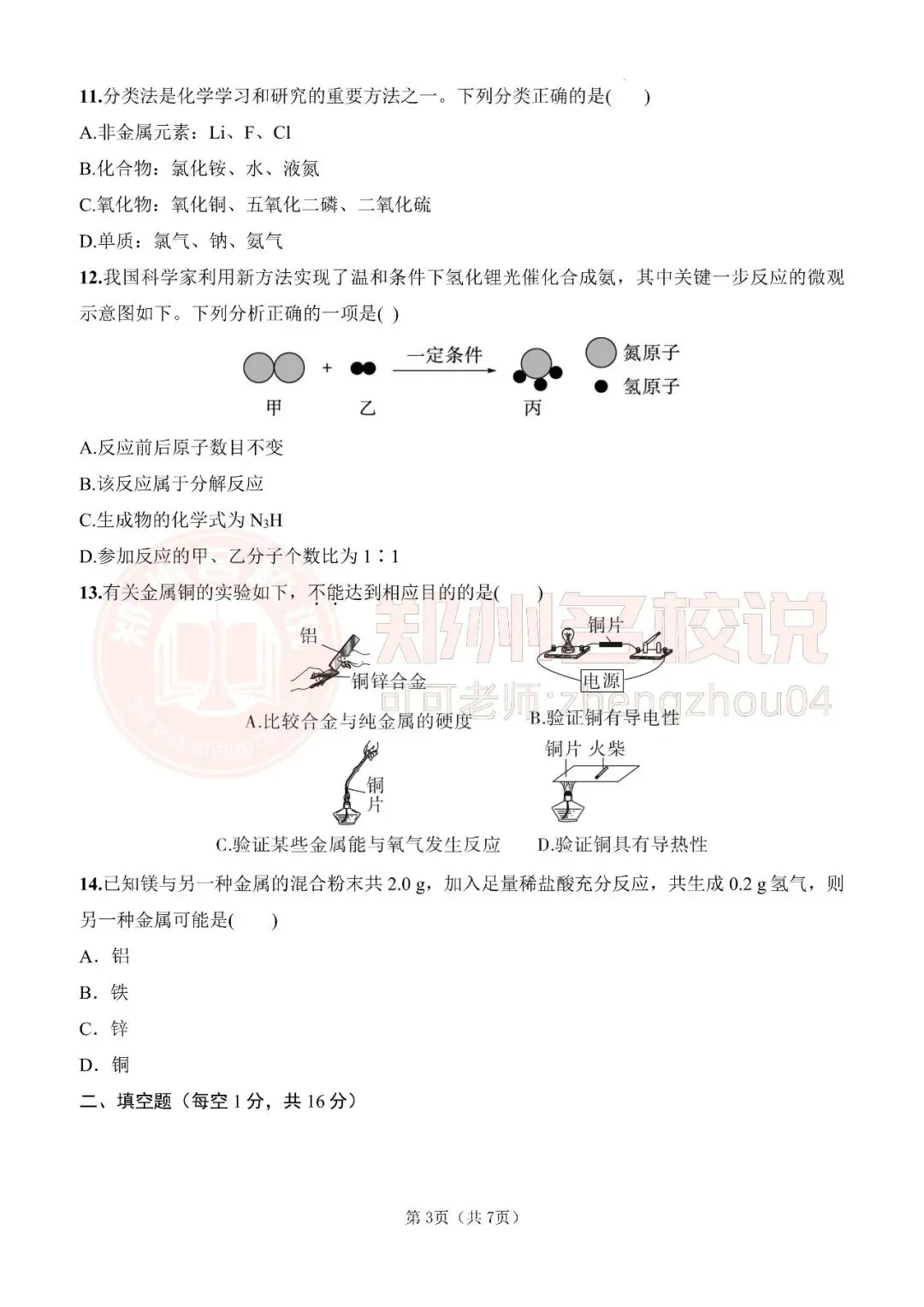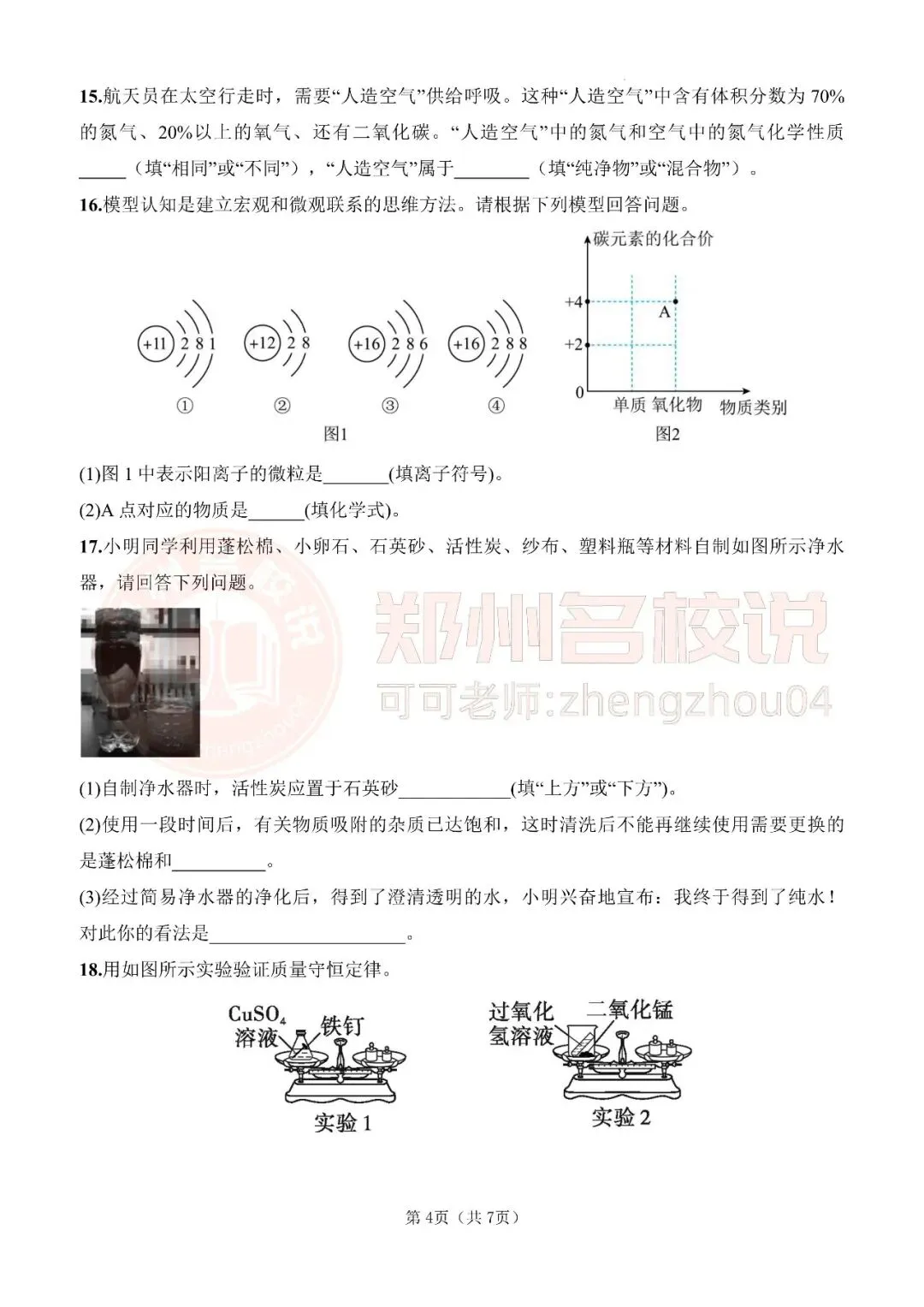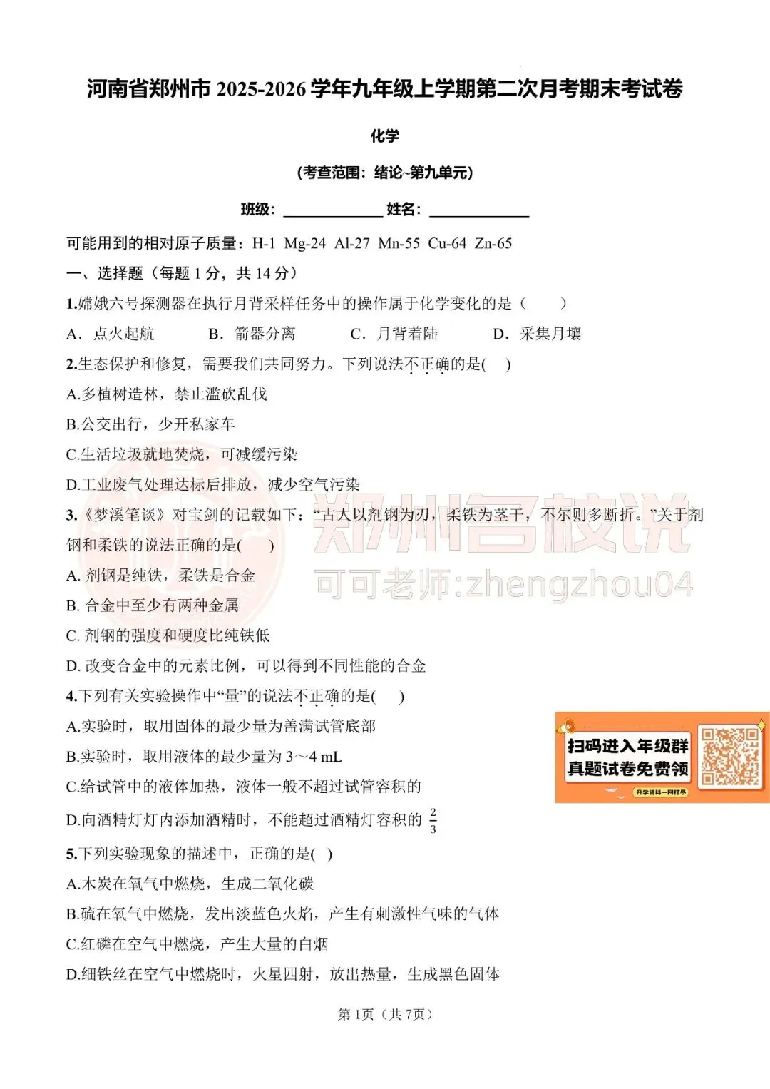 >郑州市九年级期末化学模拟试卷2025-2026上(免费分享)