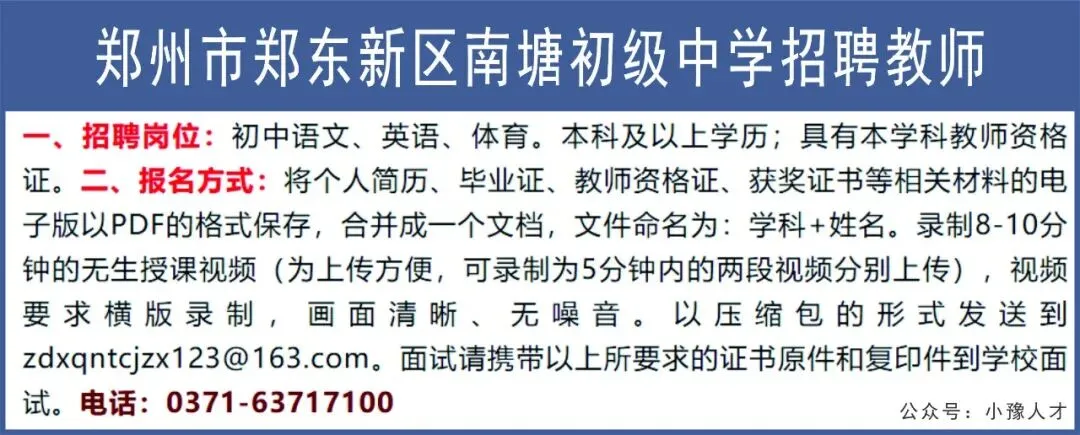>郑州市郑东新区南塘初级中学招聘教师