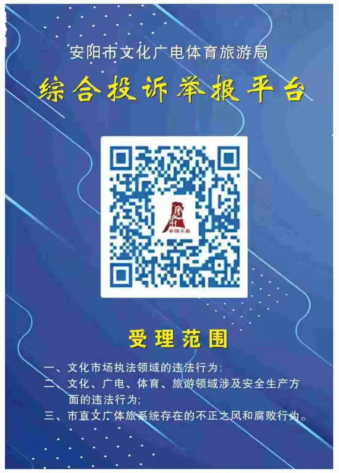 为进一步畅通信访举报与诉求表达渠道,规范投诉举报处理流程,切实强化纪检监督、安全生产监管及文旅市场治理工作,更好地维护群众和市场主体的合法权益,“安阳市文化广电体育旅游局综合投诉举报平台”现已正式建成并投入使用。