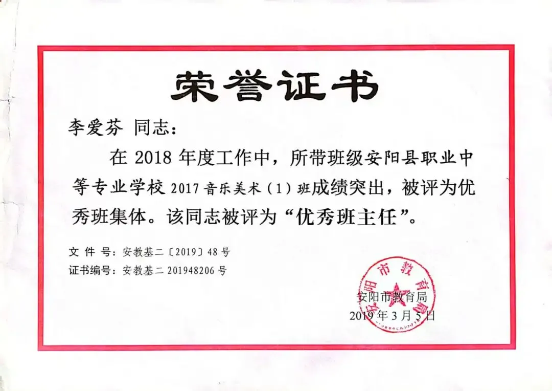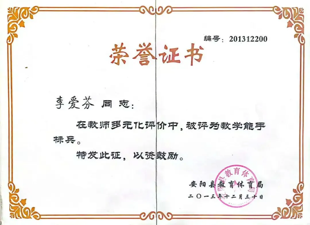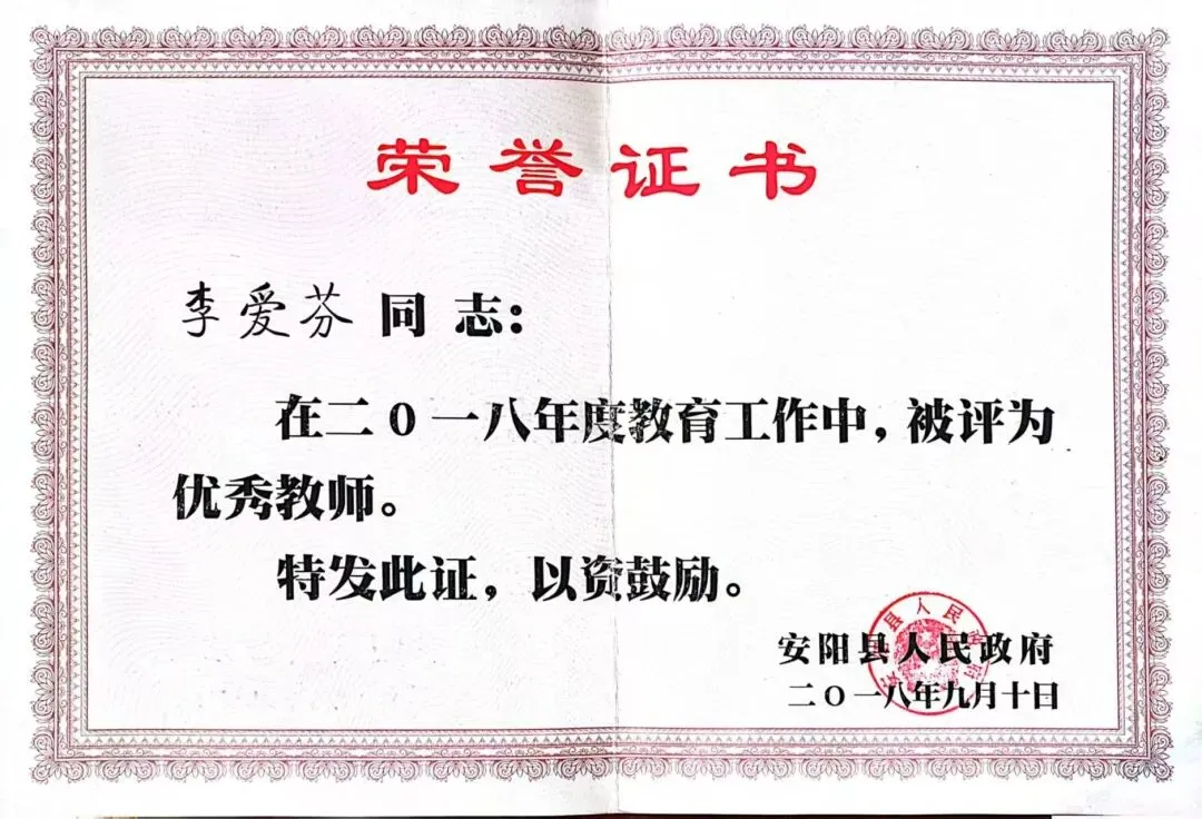在潜心育人的同时,李爱芬从未停止教研探索的脚步,多次参与观摩学习,积极研究教法与学法。2018年,她所带班级获评安阳市优秀班集体,她本人也荣获安阳市优秀班主任、安阳县优秀教师称号。此外,她多次辅导学生参加中华优秀传统文化大赛和素质能力大赛,屡创佳绩:2018年指导学生斩获“唐诗宋词”省二等奖、“成语接龙”市二等奖;2019年辅导学生李慧获“数学基础素养”市二等奖,辅导高佳齐获“数学知识应用”省二等奖。