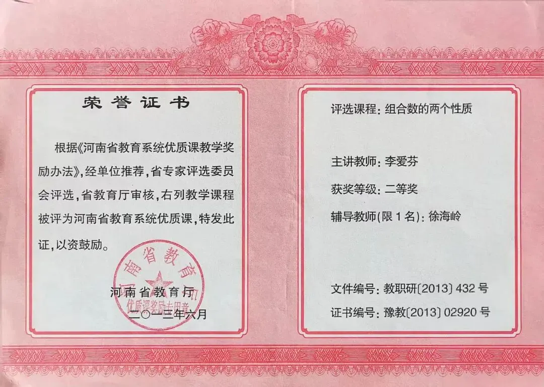 同时,她积极投身教育改革,带头实践六环节教学法,教学成效显著,获评安阳县教学能手标兵。2013年,她主讲的优质课《组合数的两个性质》荣获省级二等奖,凭借扎实的业务能力在课改之路上稳步前行。