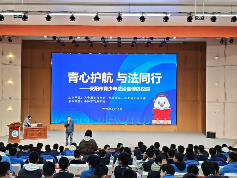 为深入贯彻习近平法治思想,强化未成年人法治素养培育,有效预防和遏制校园欺凌事件发生,20261月15日,团安阳市委联合河南大然律师事务所,携手团文峰区委走进安阳市飞翔学校,成功开展“青心护航与法同行”青少年法治宣传进校园活动。河南大然律师事务所张辰律师担任主讲,为该校300余名师生带来了一堂生动深刻的法治教育课。