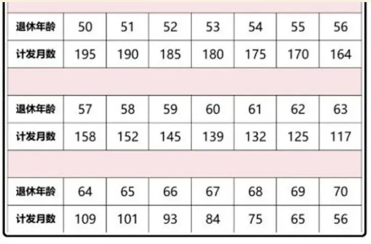其中,退休年龄对应的计发月数可以参考下表: