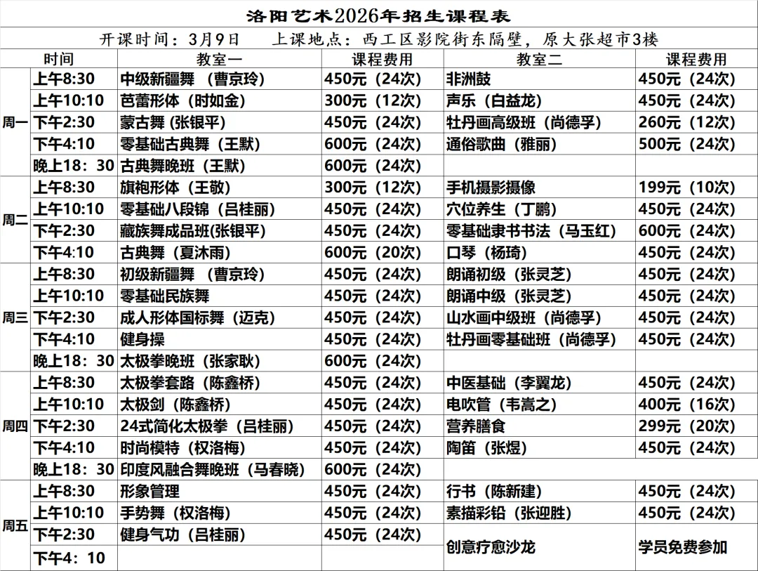 2026年3月9日(周一)起陆续开课,请学员按所报班级上课时间到校上课。国家法定节假日课程顺延。